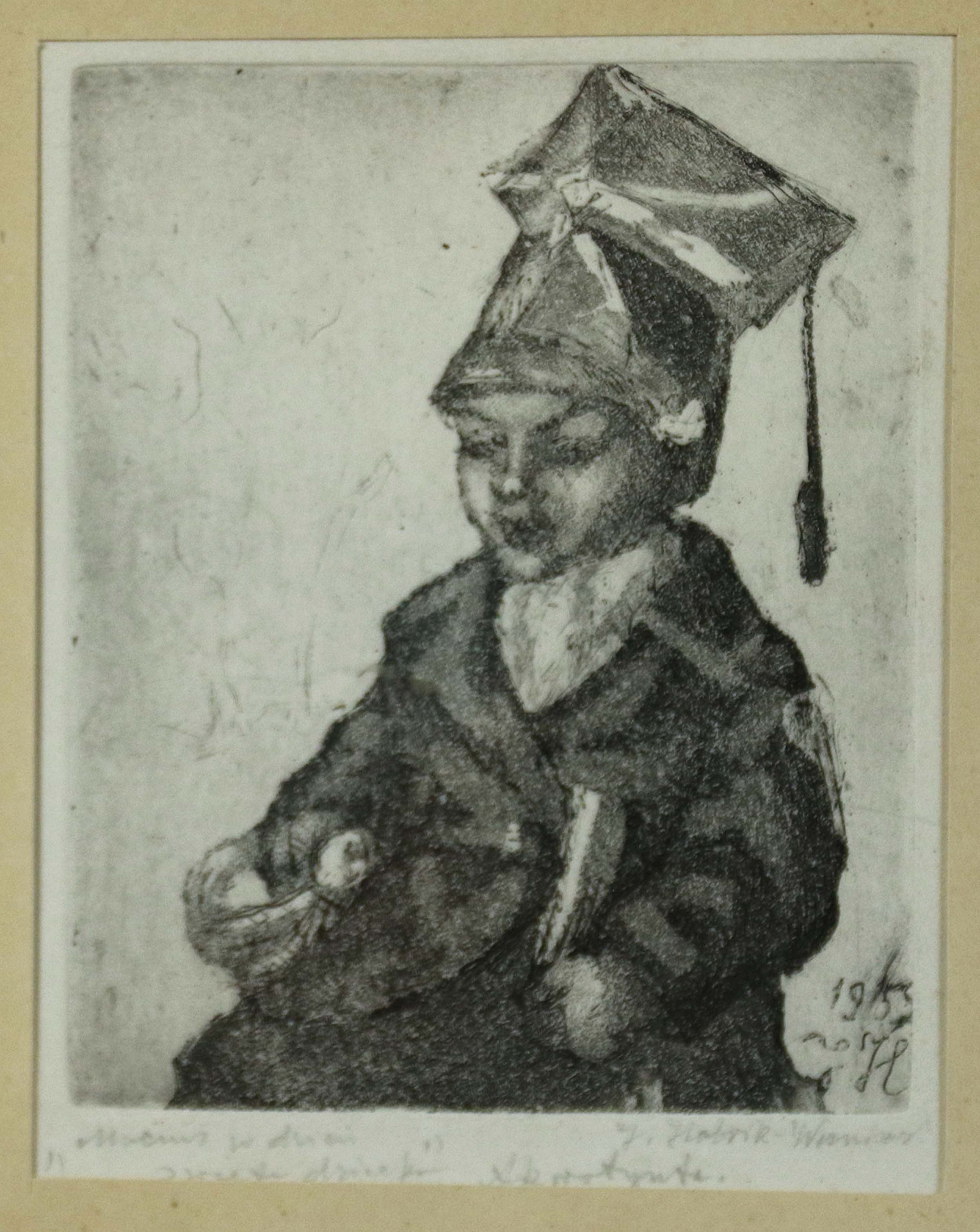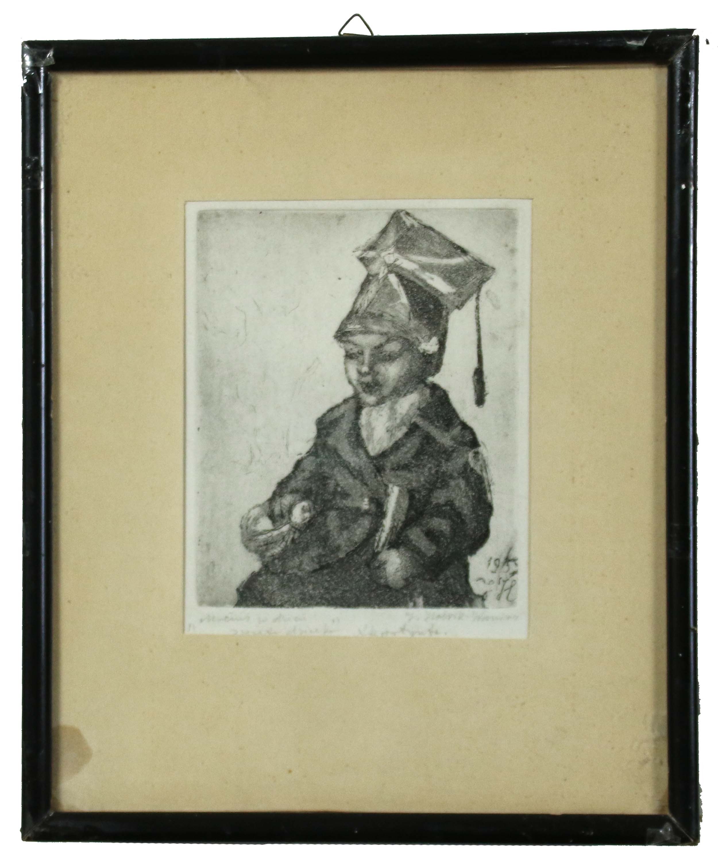 Jadwiga HABRIK-WIŚNIEWSKA (1887-1964), Maciuś w dzień święta [akwatinta 1959]. Wym. 17 x 13 cm, rama 30 x 26 cm. Szkło.