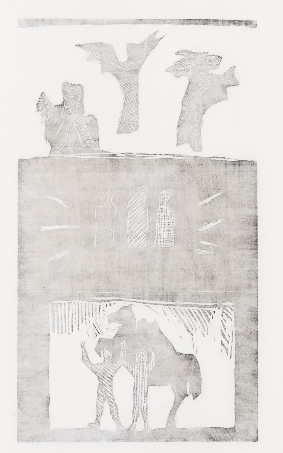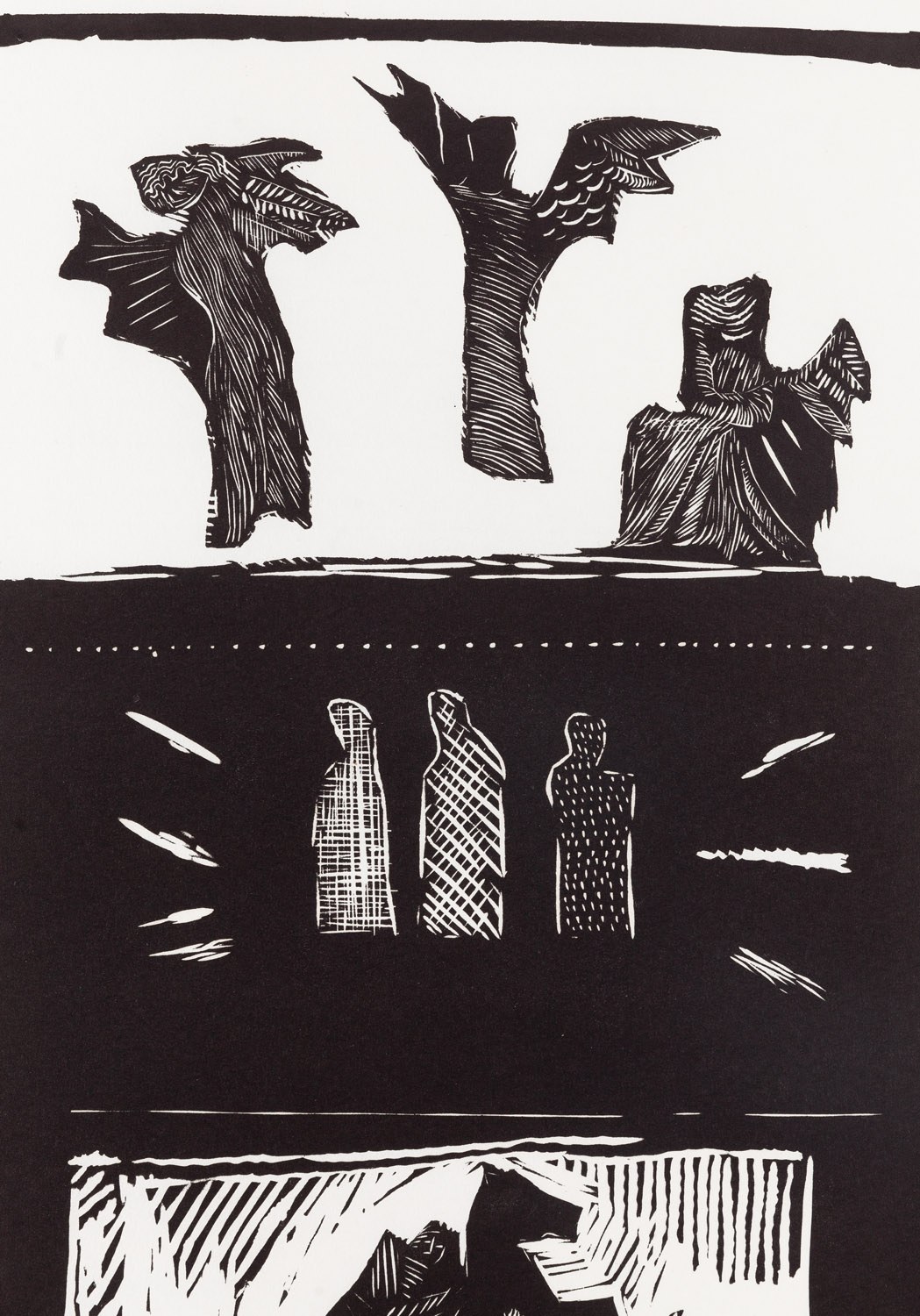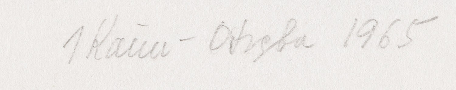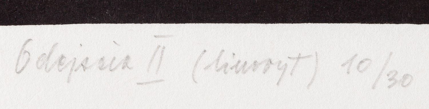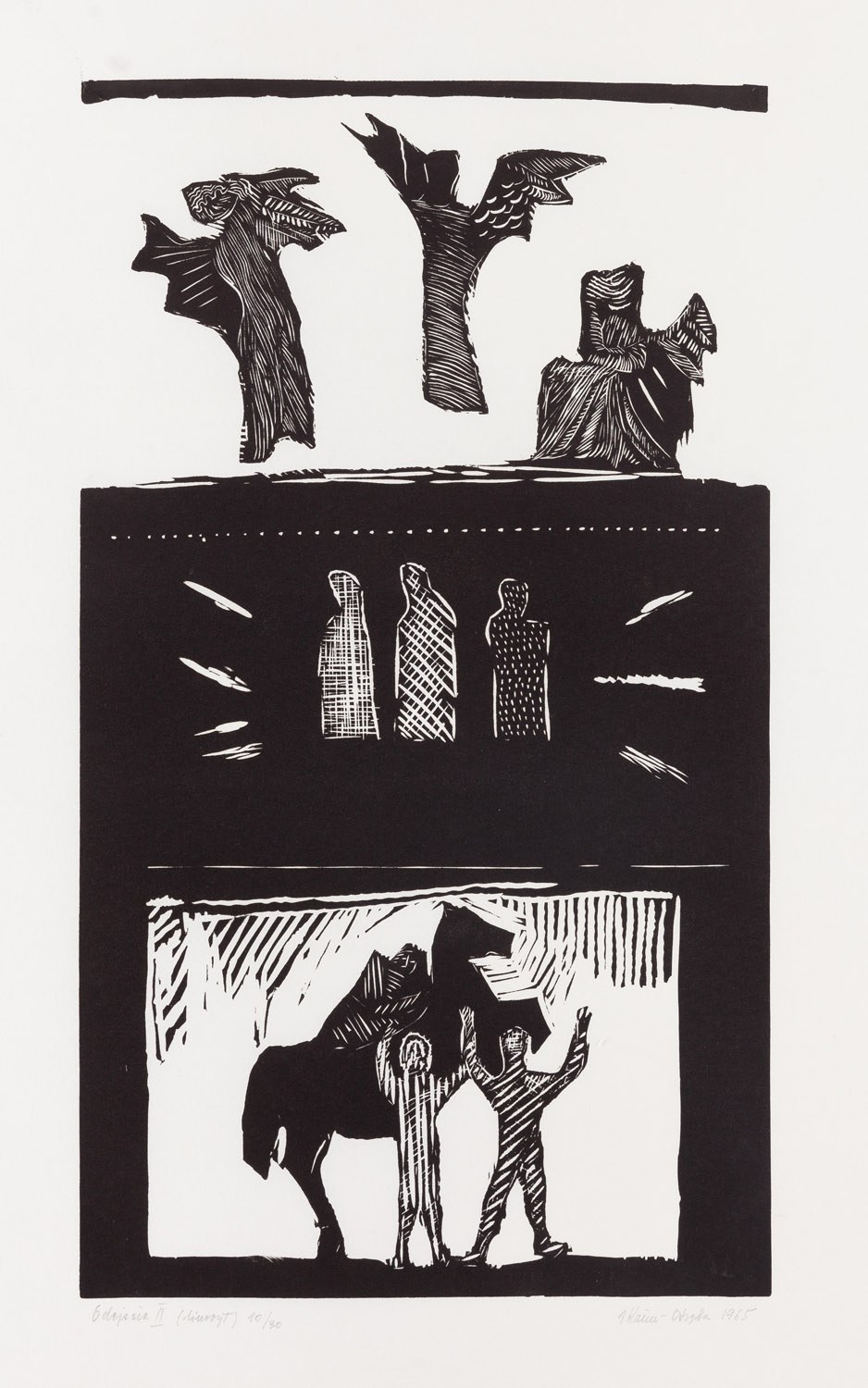 sygnowany, datowany, opisany i numerowany ołówkiem poniżej kompozycji: 'Odejścia II (linoryt) 10/30 | J Kaim-Otręba 1965'
