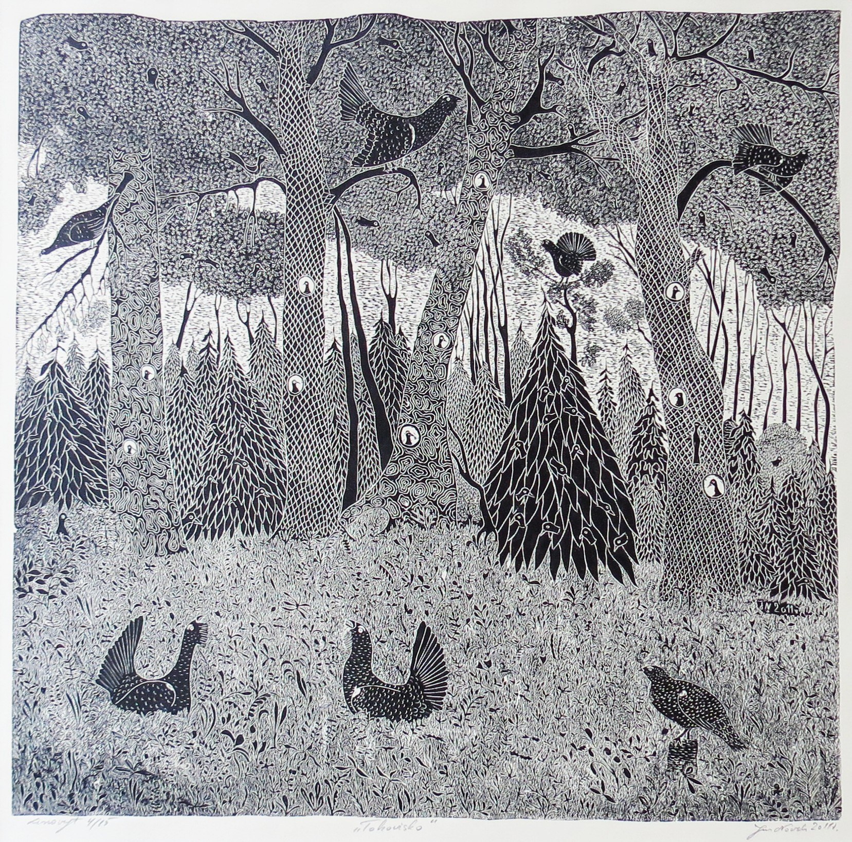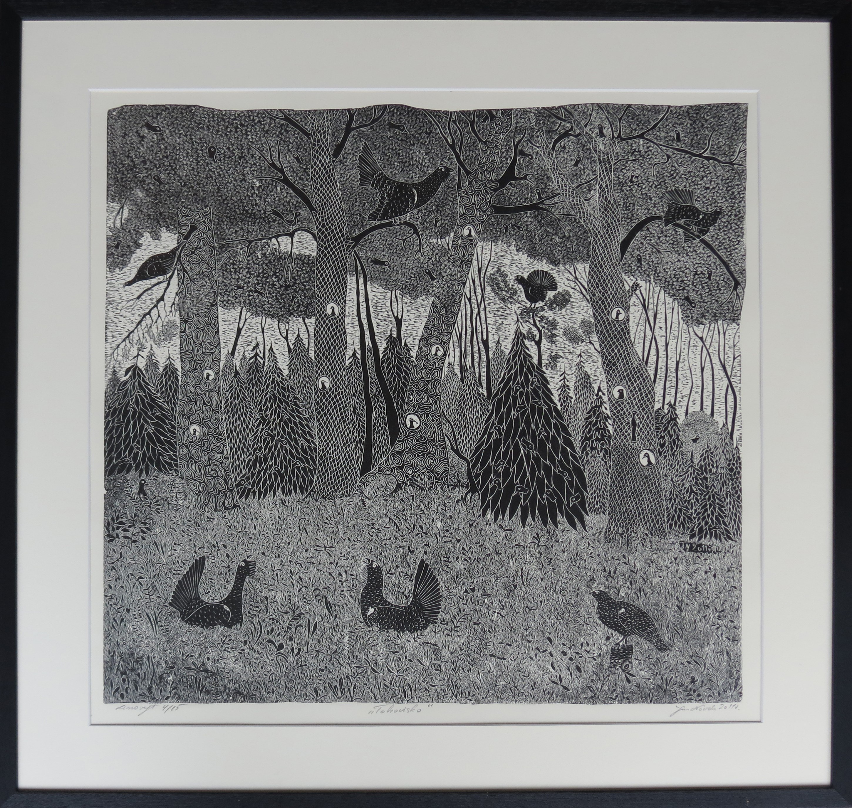 sygn. oł. p.d.: Jan Nowak 2011; oł. l.d.: Linoryt 4/15 "Tokowisko", monogramem na płycie p.d.: JN 2011