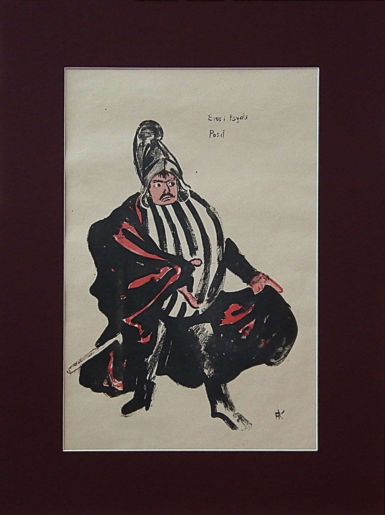 autolitografia, papier; 45 x 30 cm w świetle passe – partout o wym. 61x 46 cm; sygn. na kamieniu p.d. monogram wiązany „KF” oraz tytuł ręką autora p.g. „Eros i Psyche Poseł”
