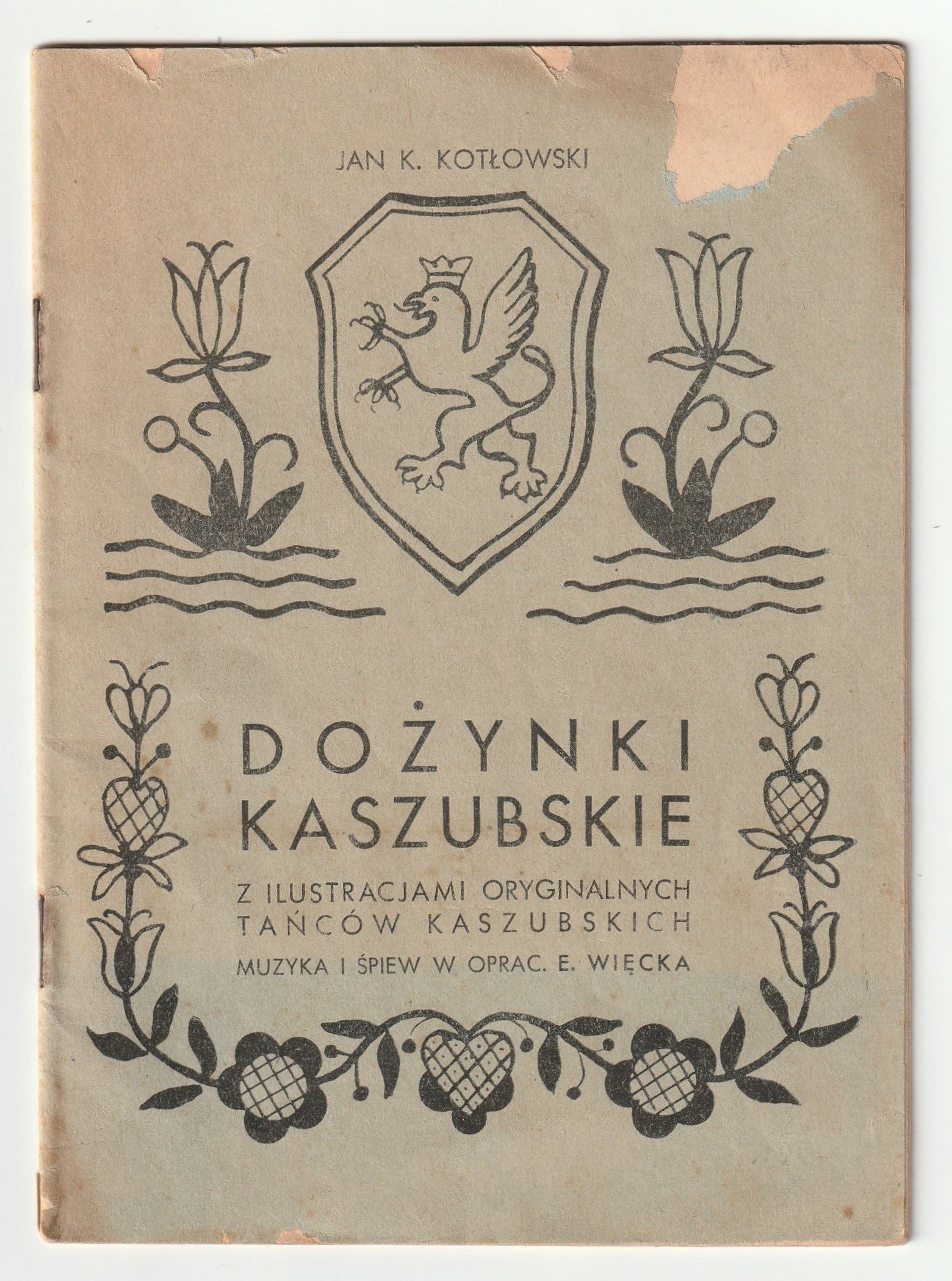 KASZUBY, KOTŁOWSKI, JAN K., DOŻYNKI KASZUBSKIE Z ILUSTRACJAMI ORYGINALNYCH TAŃCÓW KASZUBSKICH. Śpiewnik, muzyka i śpiew w oprac. E. Więcka, Luzino 1936, nakładem autora; 20 str. + 12 nlb., st. bdb., lekkie zabrudzenia, okładka broszurowa, z ubytkiem; format 16o.