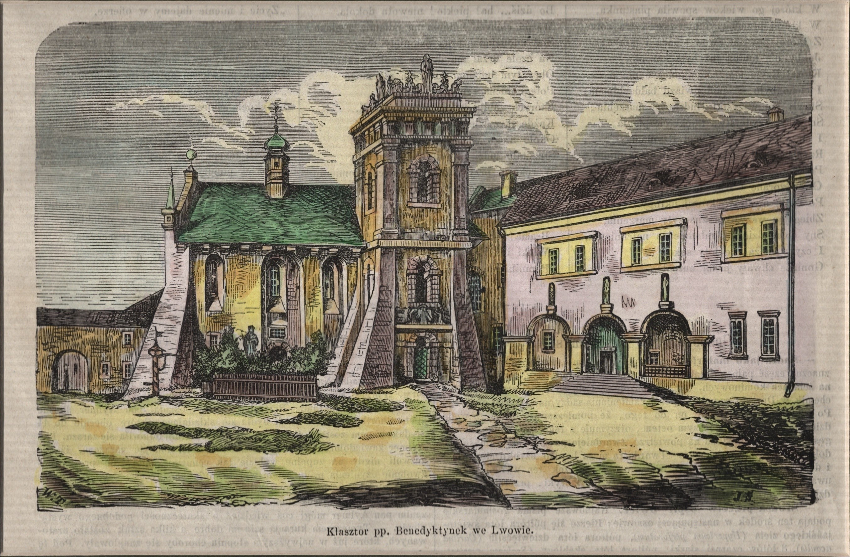 Klasztor pp. Benedyktynek we Lwowie. Drzeworyt kolorowany.