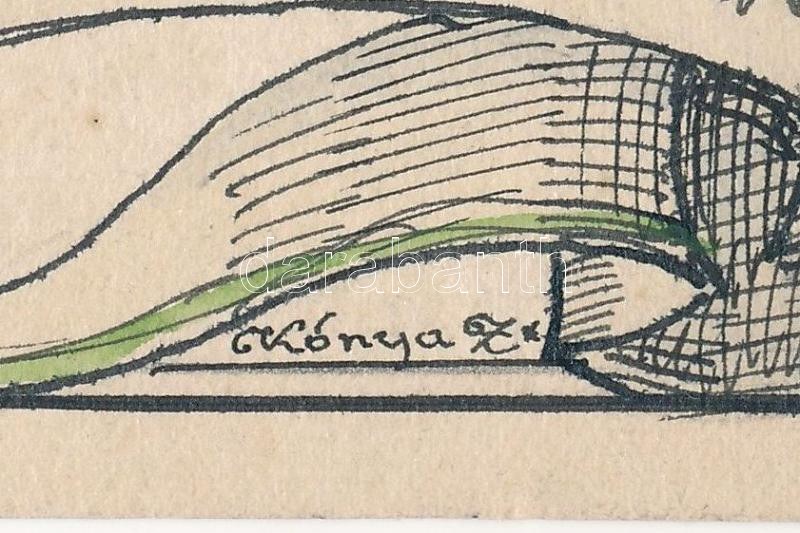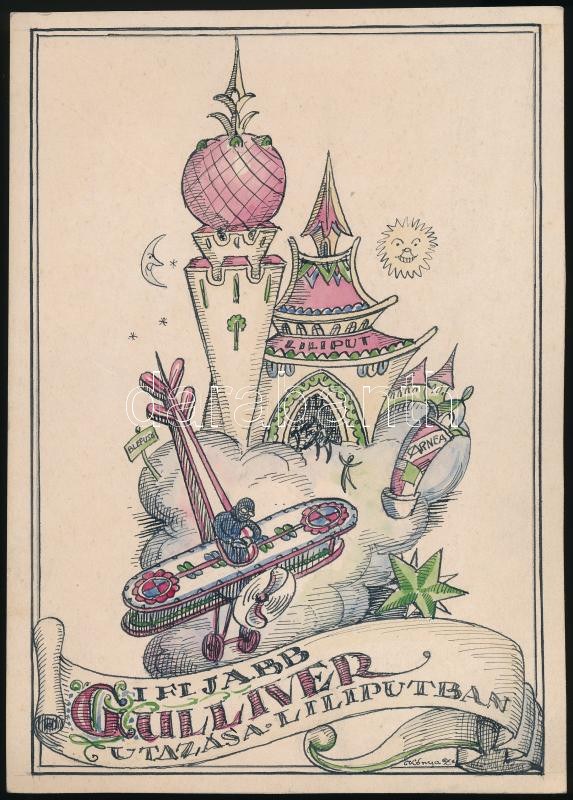 Kónya Zoltán (?-?): Könyvborító terve, ifj. Gulliver utazása Lilliputban c. művéhez. Vegyes technika, papír, jelzett...