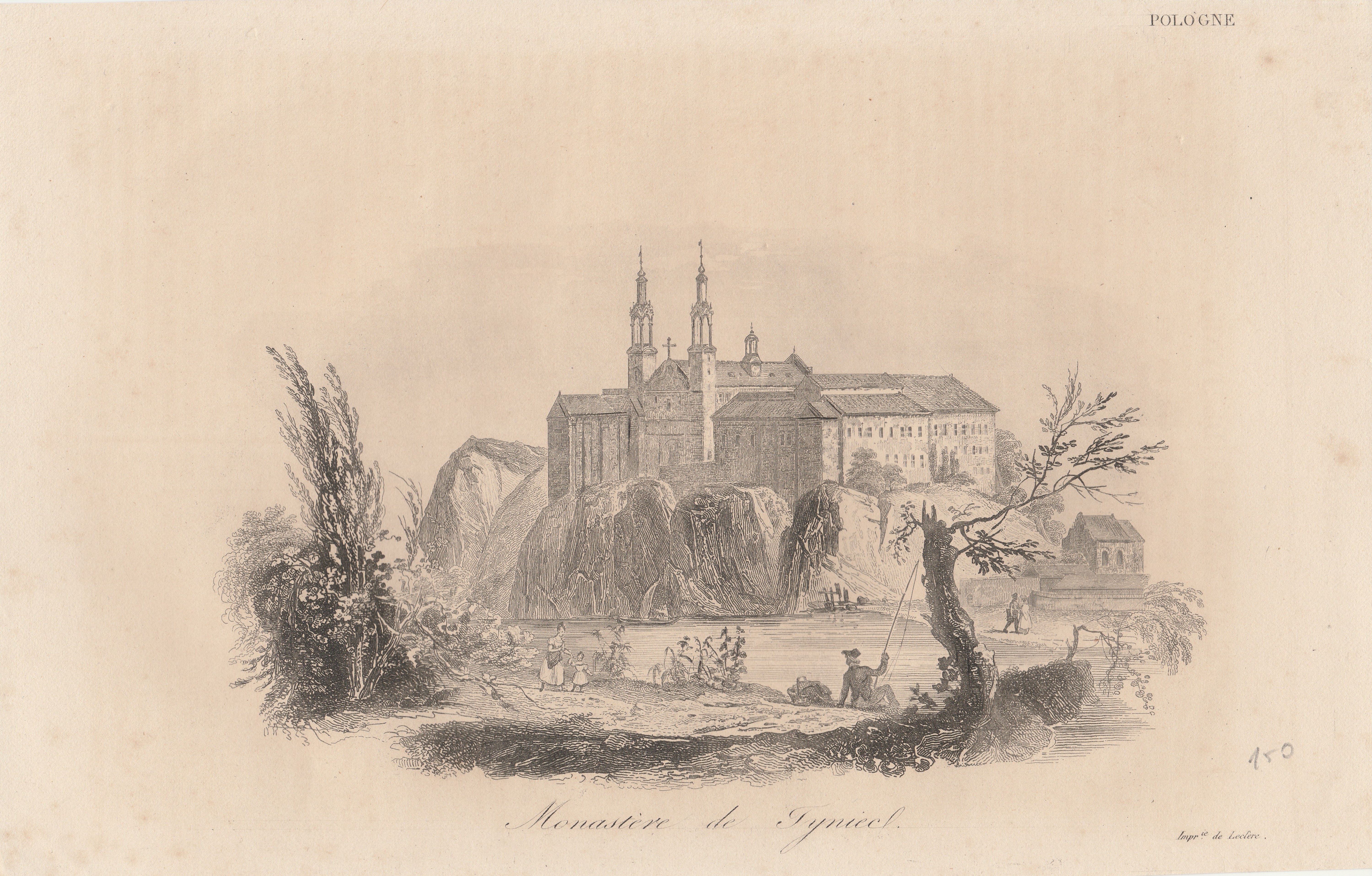 KRAKÓW, TYNIEC. Widok na Klasztor w Tyńcu, druk. Leclere (sygn. na płycie Impr. de Leclere.), pochodzi z: dzieła: La Pologne historique, littéraire, monumetale et pittoresque... autorstwa Leonarda Chodźko, wyd. Bureau Central, Paryż 1835-1842, stal. cz.-b., st. db., wymiary arkusza: ok. 265x170 mm; Monastere de Tyniec.