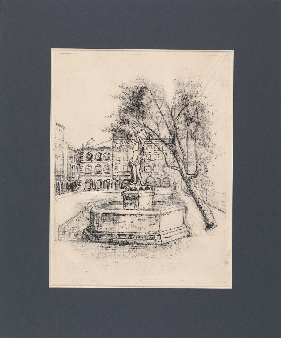 Miękki werniks. Wym. odb. 21,8 x 16,5 cm, arkusza 27 x 22,5 cm. Grafika sygn. w jęz. ukraińskim "Kratochwila-Widymska".