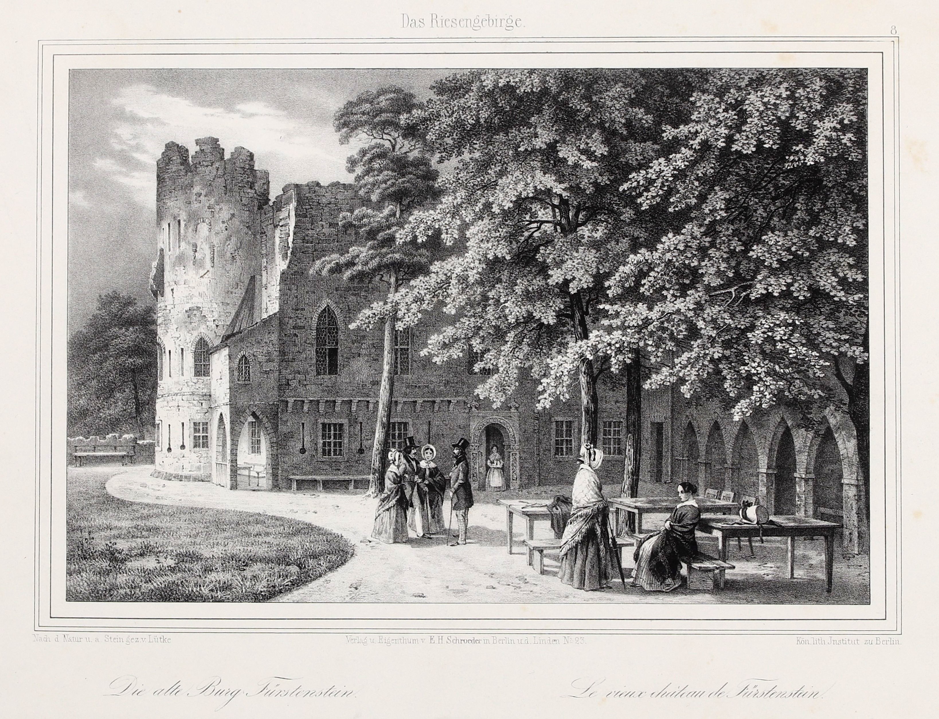 KSIĄŻ, STARY KSIĄŻ, WAŁBRZYCH. Widok zamku; rys. L.E. Lütke, wyd. E.H. Schroeder, 1865; tłoczony znak wyd.; nad górną ramką: Das Riesengebirge; lit. cz.-b., st. bdb., delikatne zabrudzenia; wym. widoku 244x168 mm; tyt. dwujęzyczny: Die alte Burg Fürstenstein. Le vieux château de Fürstenstein.