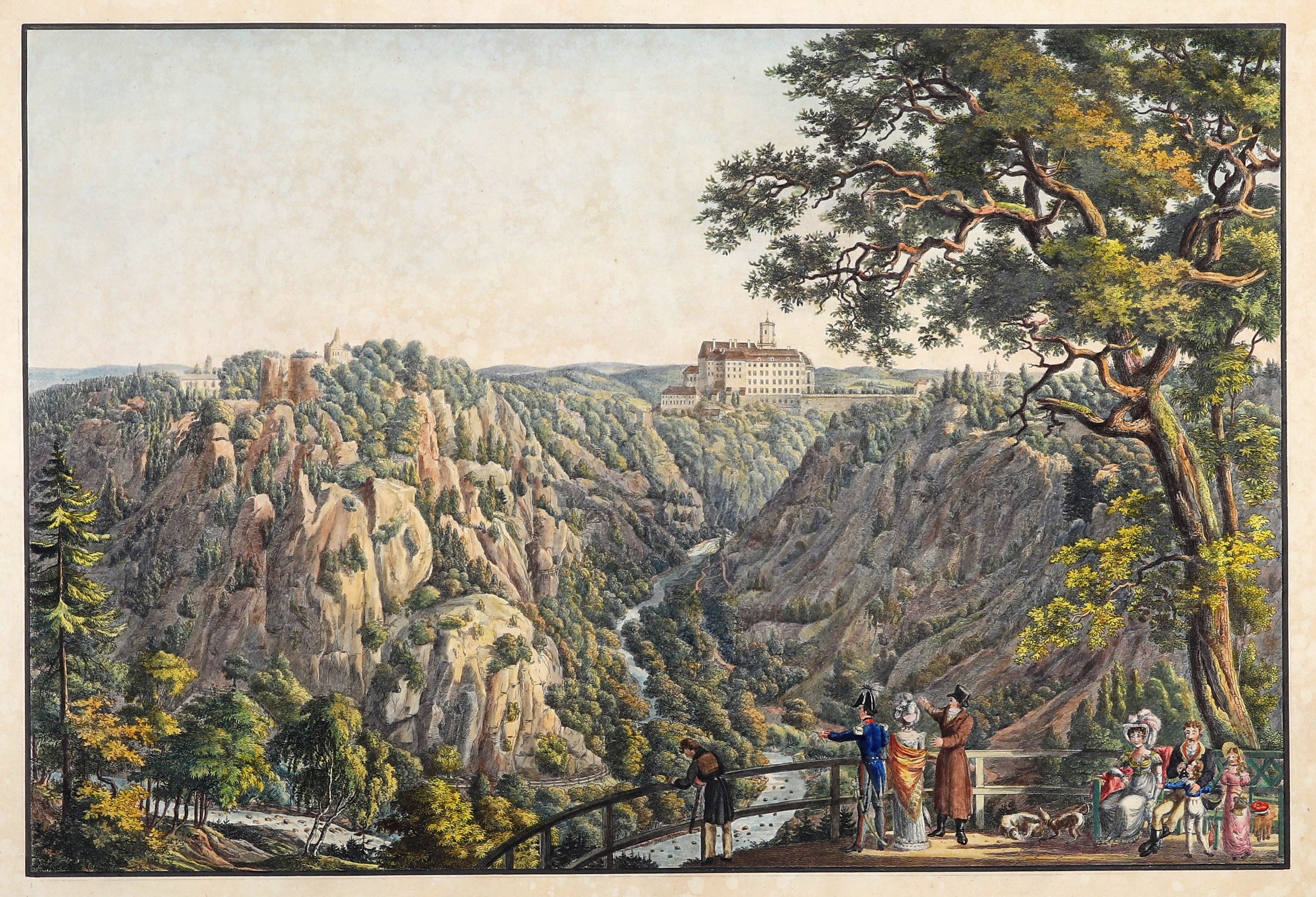 KSIĄŻ, WAŁBRZYCH. Panorama Książa z zamkiem Stary Książ; anonim, ok. 1800; znak wodny: C & I Honig; akwf. kolor., st. bdb., papier zażółcony, niewielkie naddarcie górnej krawędzi; wym. widoku 476x320 mm; wym. płyty ok. 510x400 mm; bez tyt.; BARDZO RZADKIE.