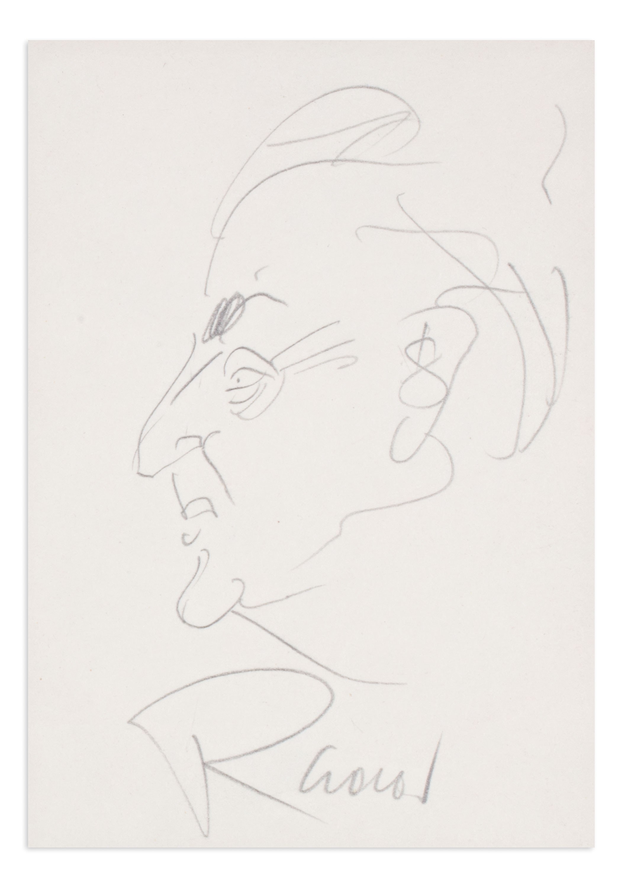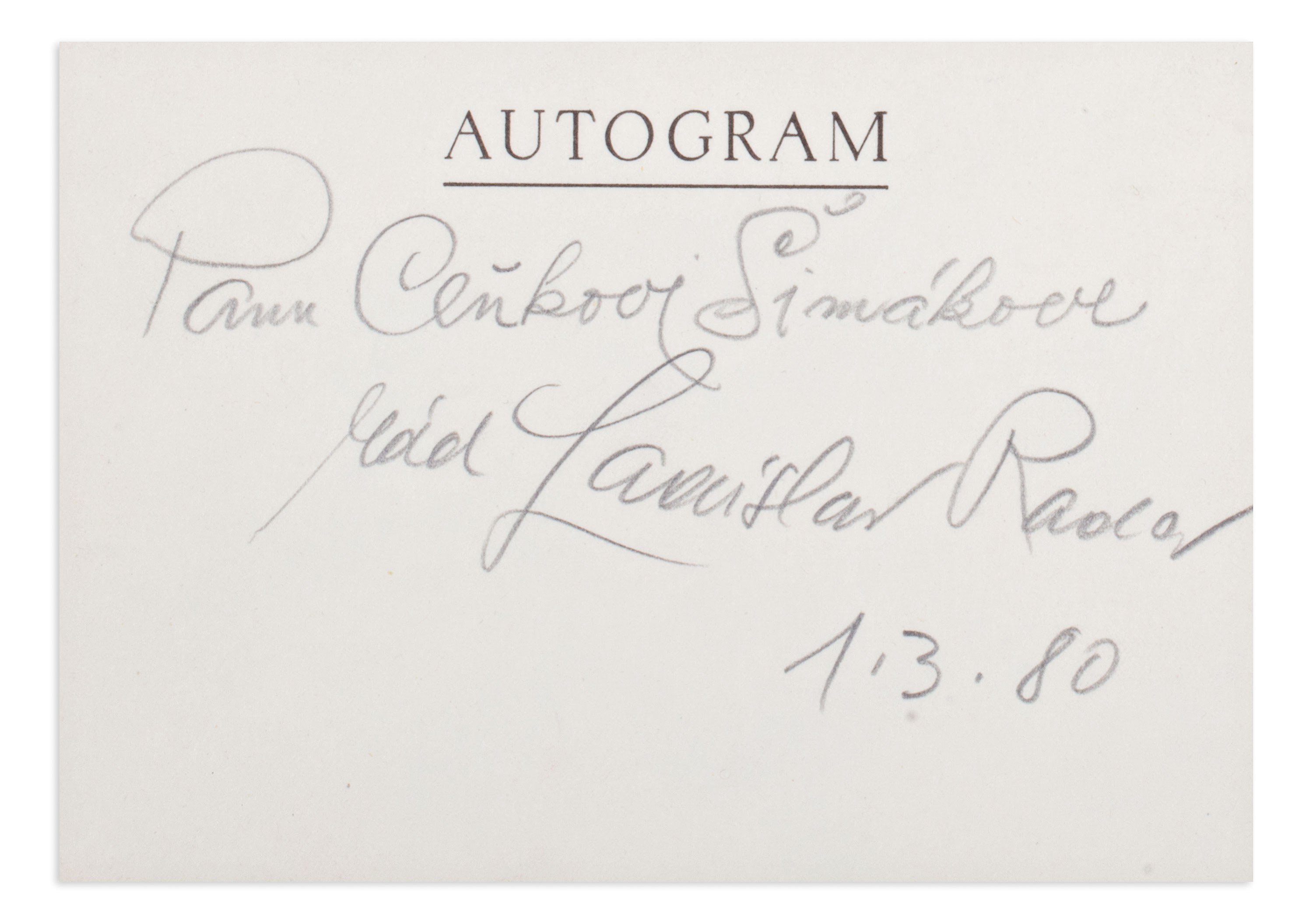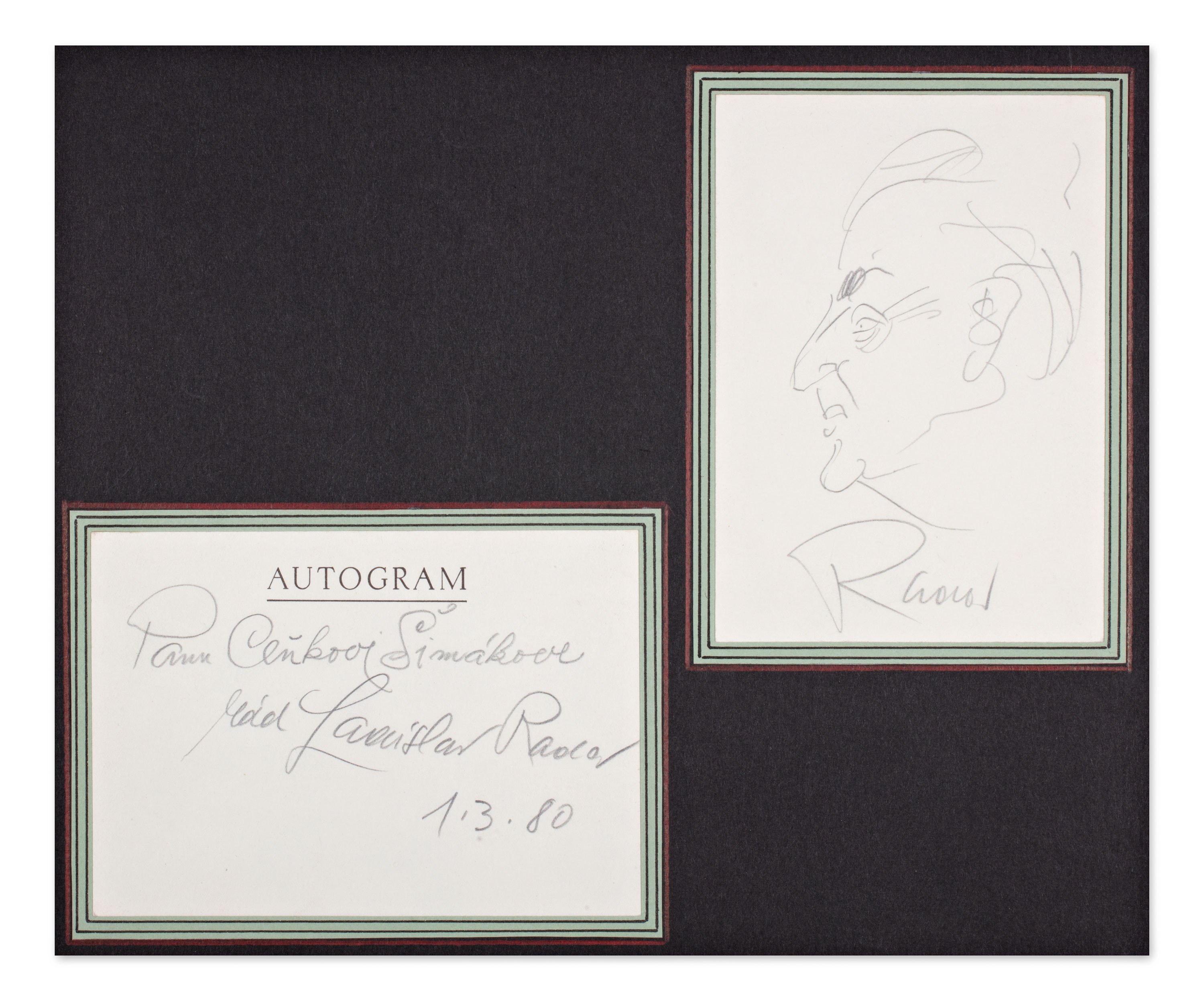 Autograph of Ladislav Rada with a dedication and dated "1. 3. 80," accompanied by his typical drawn caricature.Ladislav Rada was a prominent Czech caricaturist, illustrator, and graphic artist, best known for his satirical drawings and portrait caricatures. Throughout his career, he collaborated with numerous Czech and international periodicals, and his work appeared in many collections and publications.