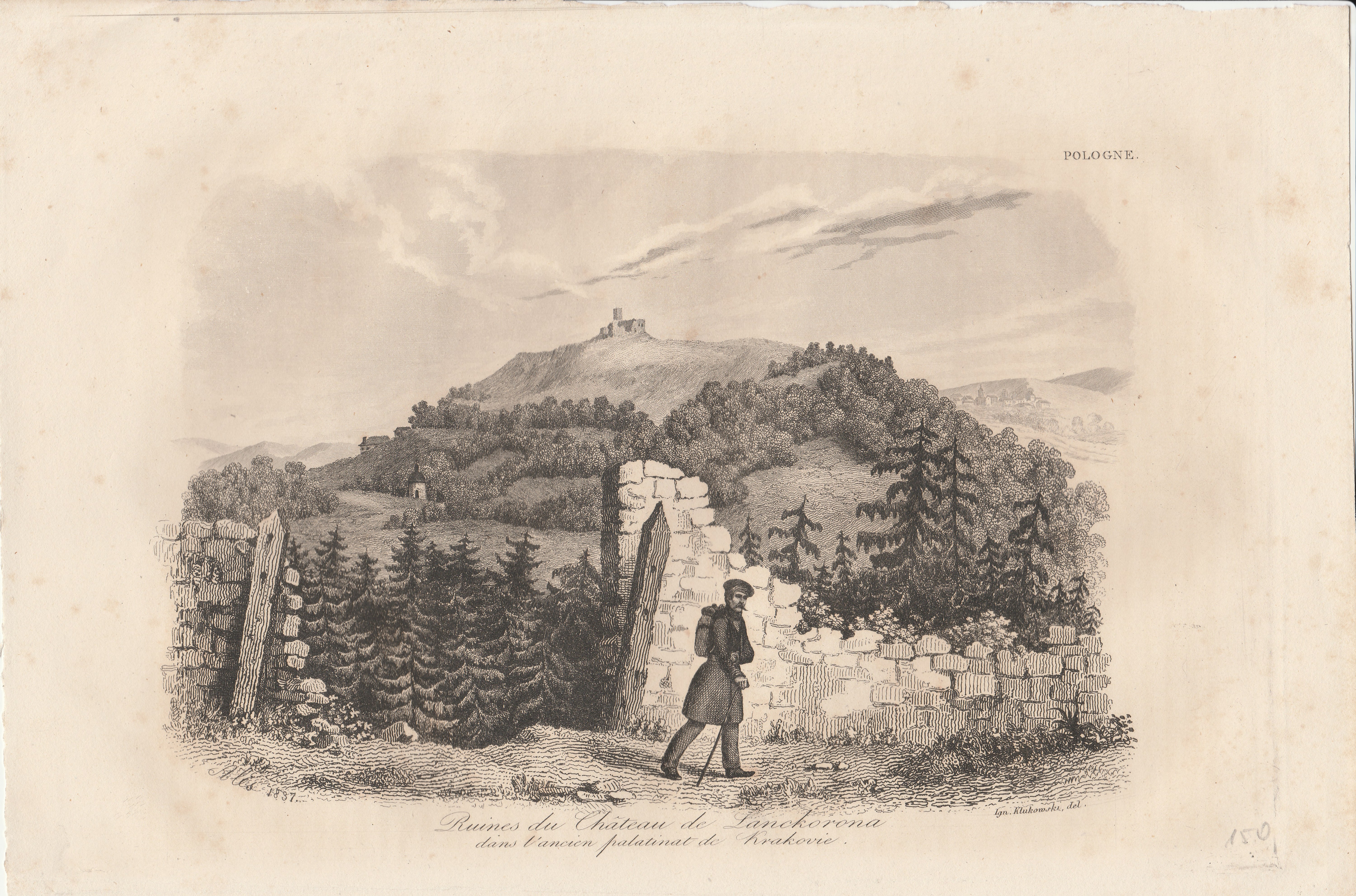 LANCKORONA. Widok na ruiny zamku w Lanckoronie, projektował Ignacy Klukowski (na dole sygn.: Ign. Klukowski del.), ryt. Auguste François Alés (sygn. na dole Ales 1837), pochodzi z: dzieła: La Pologne historique, littéraire, monumetale et pittoresque... autorstwa Leonarda Chodźko, wyd. Bureau Central, Paryż 1835-1842, stal. cz.-b., st. db., górny brzeg arkusza postrzępiony, wymiary arkusza: ok. 280x185 mm; Ruines du Chateau de Lanckorona / dans l'ancien palatinat de Krakovie.