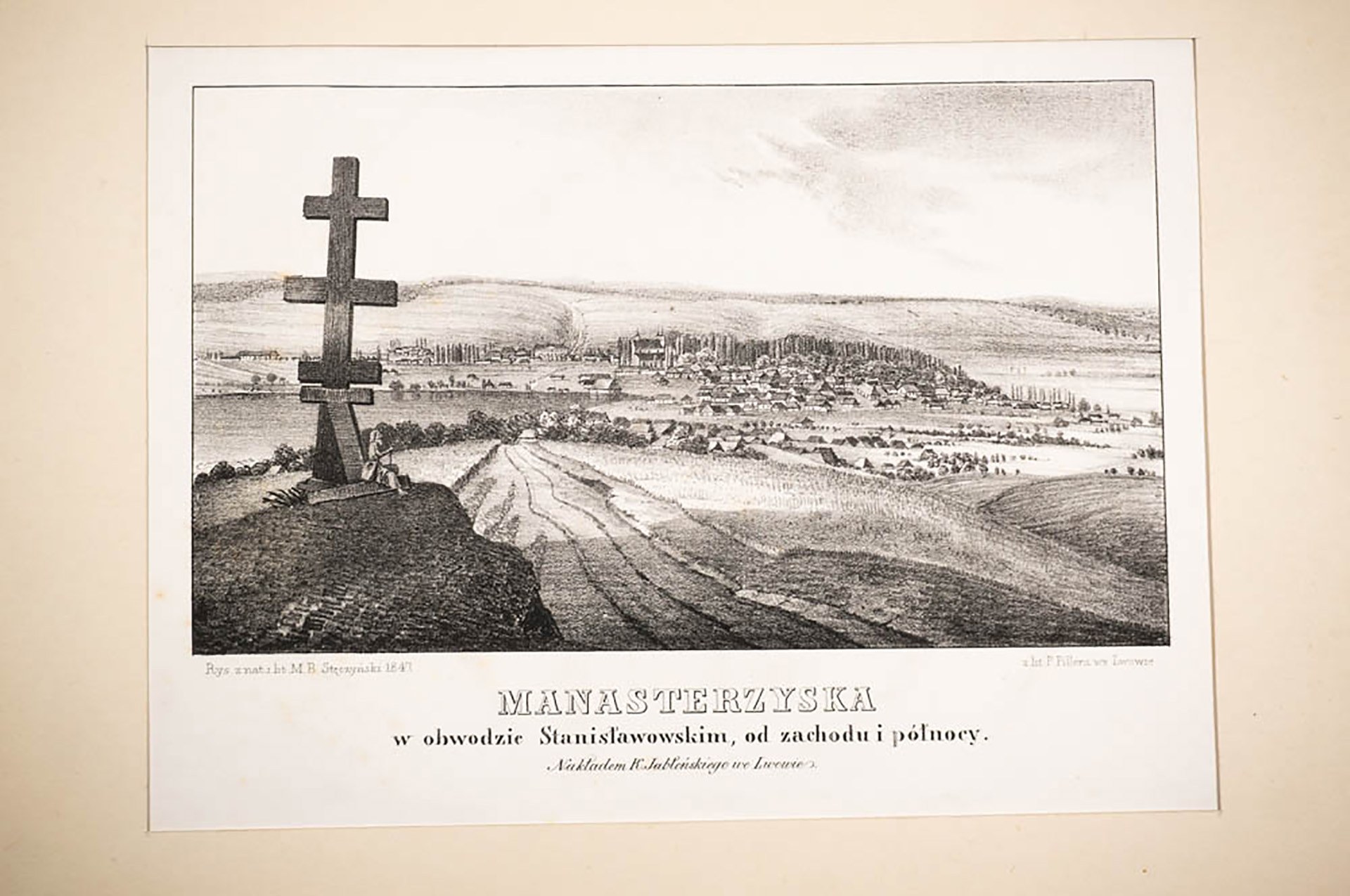 LITOGRAFIA Manasterzyska w obwodzie Stanisławowskim od zachodu i północy - rysował z natury i litografował M.B. Stęczyński, z lit. P.Pillera we Lwowie, 1847r., f. 34 x 28,5 (passe-partout), 20,5 x 15,5cm w świetle passe-partout, RZADKIE