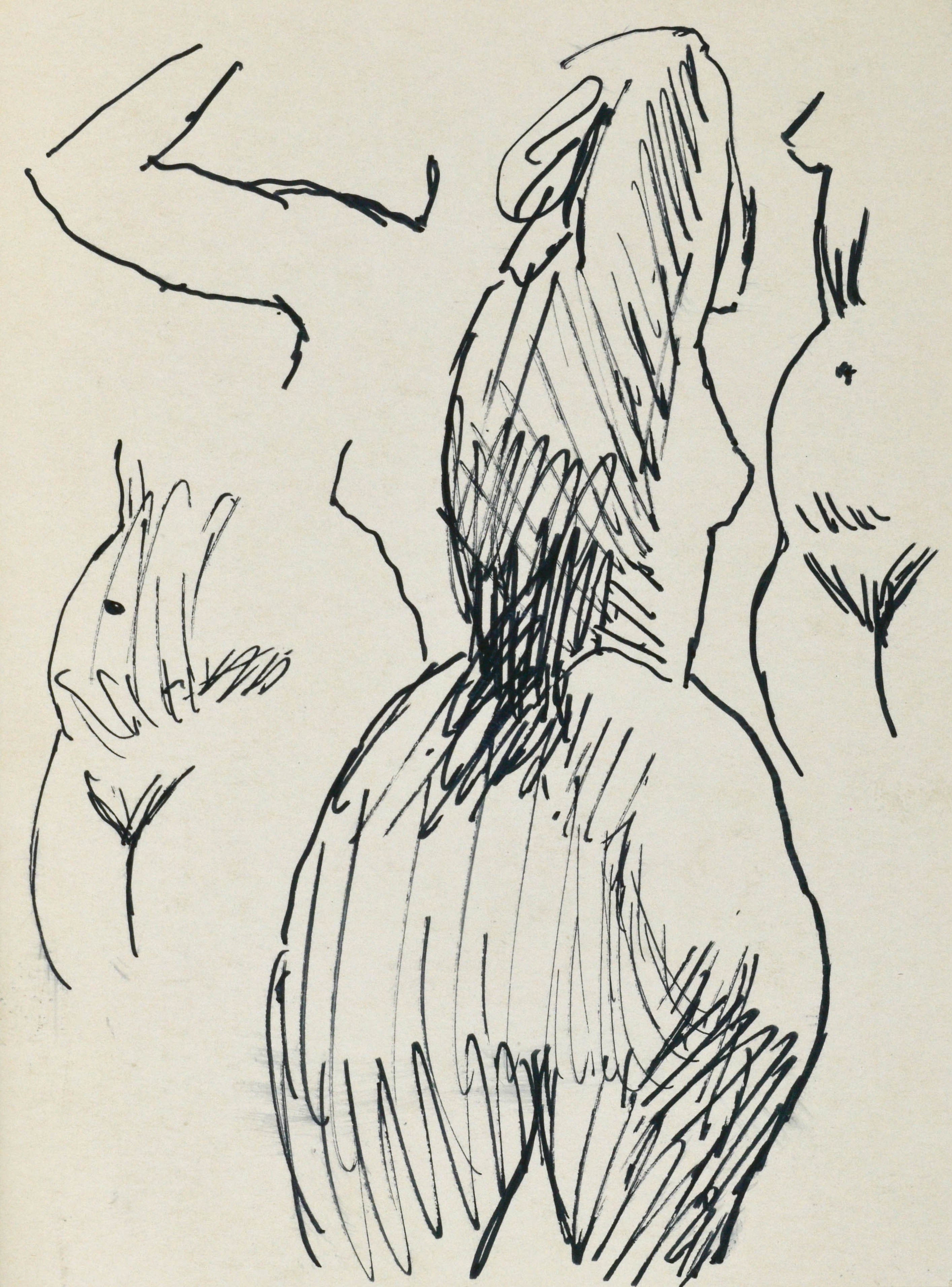 Rysunek wykonany na zaproszeniu na wernisaż wystawy malarstwa i rysunków Iraidy Cwietkow w dniu 25 sierpnia 1966 roku w Galerii Sztuki MDM.