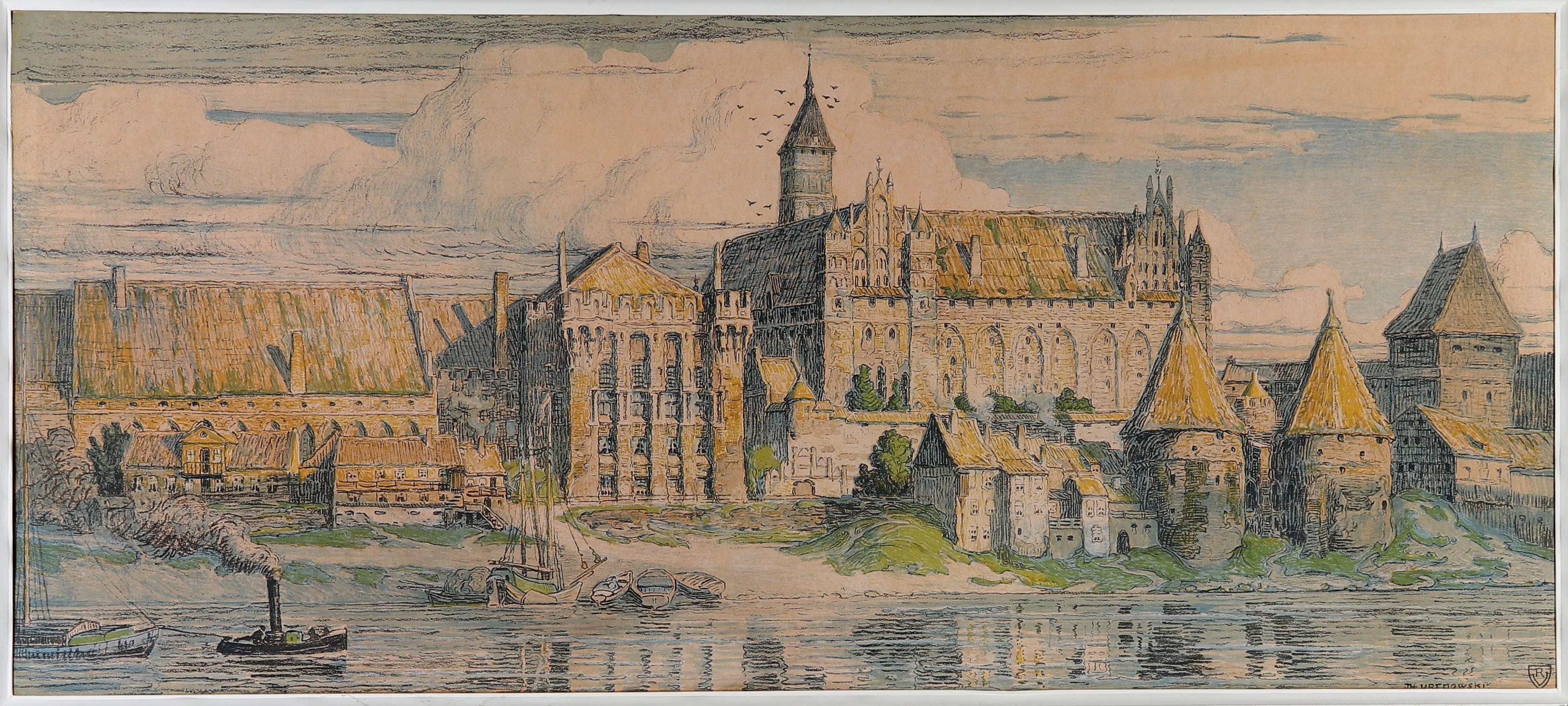 MALBORK. Widok ogólny zamku od str. Nogatu; lit. znany artysta malarz i grafik, Theodor Bolesław Urtnowski (1881–1963), lata 20. XX w.; lit. barwna, st. bdb., passe-partout; wym. w świetle passe-partout 877x386 mm; bez tyt.; BARDZO EFEKTOWNE!