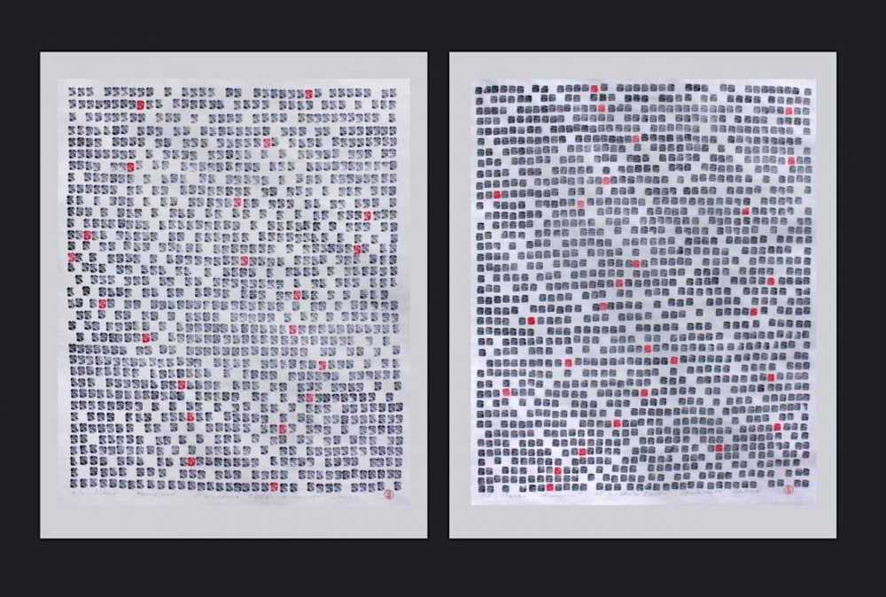dyptyk, tusz, papier japoński, 38 cm x 48 cm każda, monoprint, sygn. p.d., oprawione