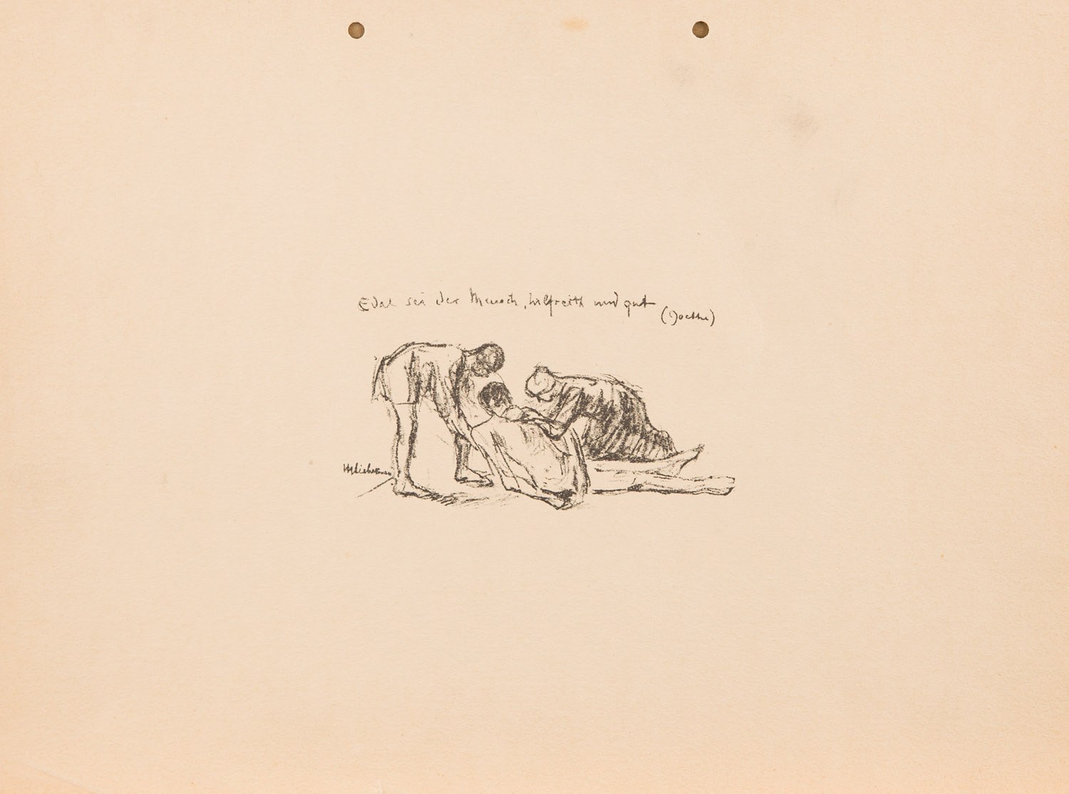 litografia, papier, 27 x 35 cm. Na grafice cytat z Goethego w tłumaczeniu :”Szlachetnością człowieka jest pomoc i dobro”. Dwa otwory do wpięcia, dziurkaczem na marginesie. Stan dobry.