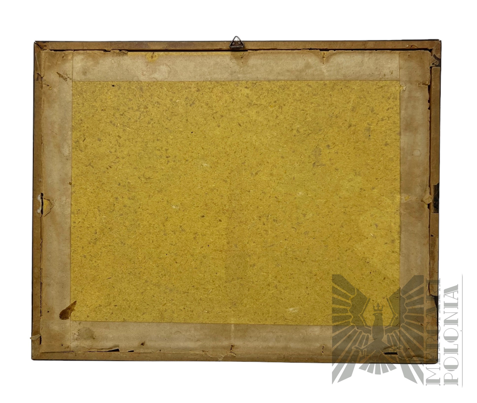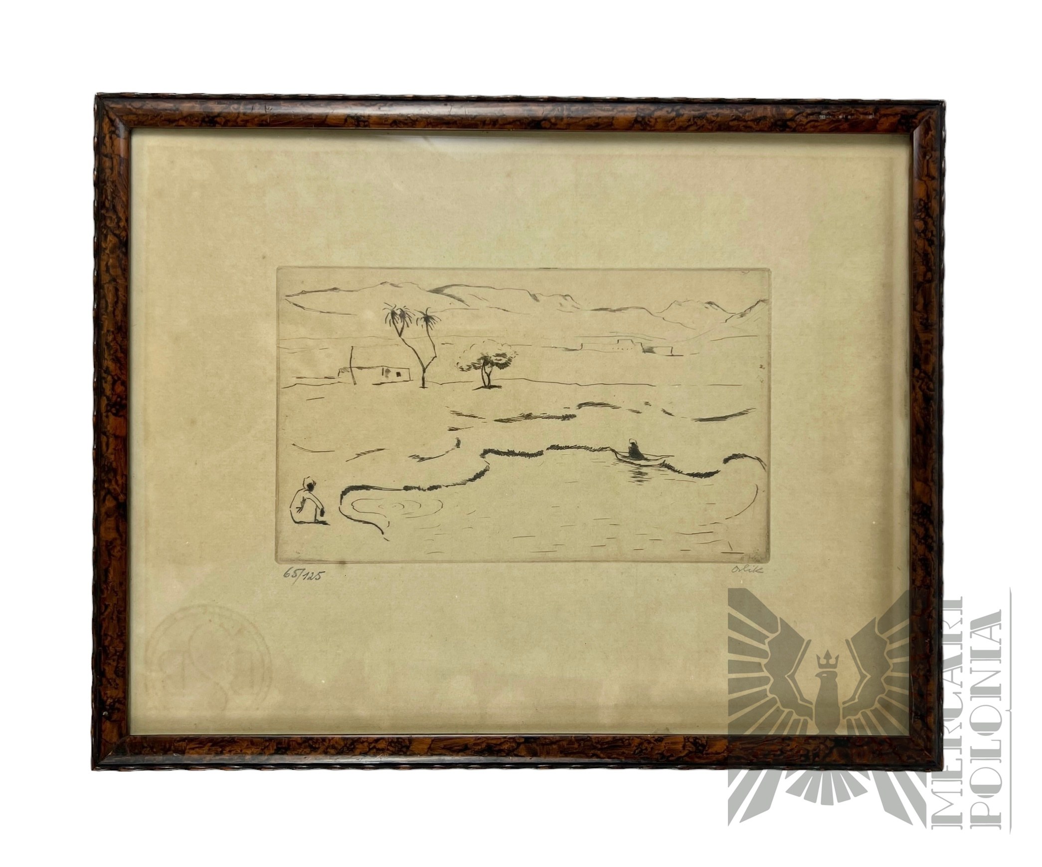 Oprawione minimalistyczne przedstawienie pustynnego krajobrazu, najprawdopodobniej oazy.