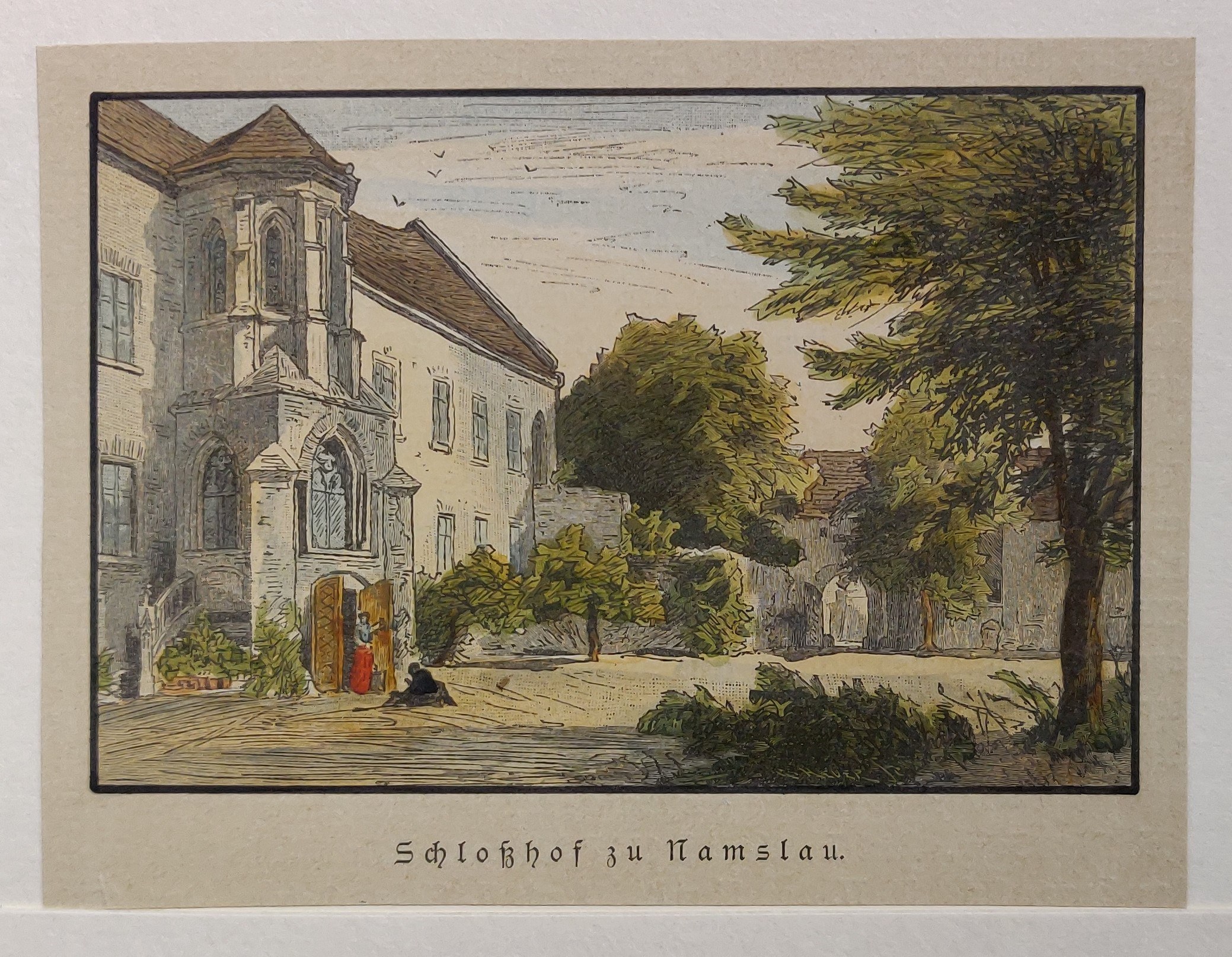 NAMYSŁÓW. Zamek; ryt. G. Heuer & Kirmse, 1891; drzew. szt. kolor., st. bdb., passe-partout; wym.: 110x74 mm; Schloβhof zu Namslau;