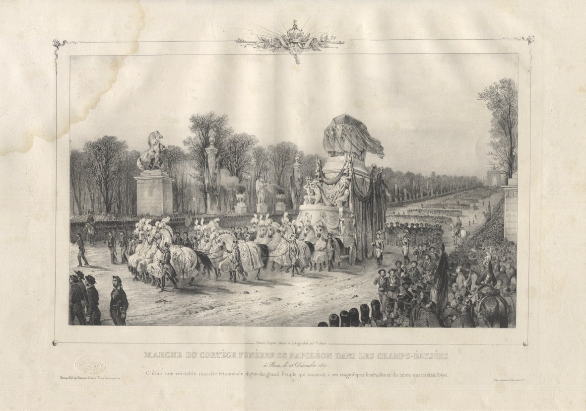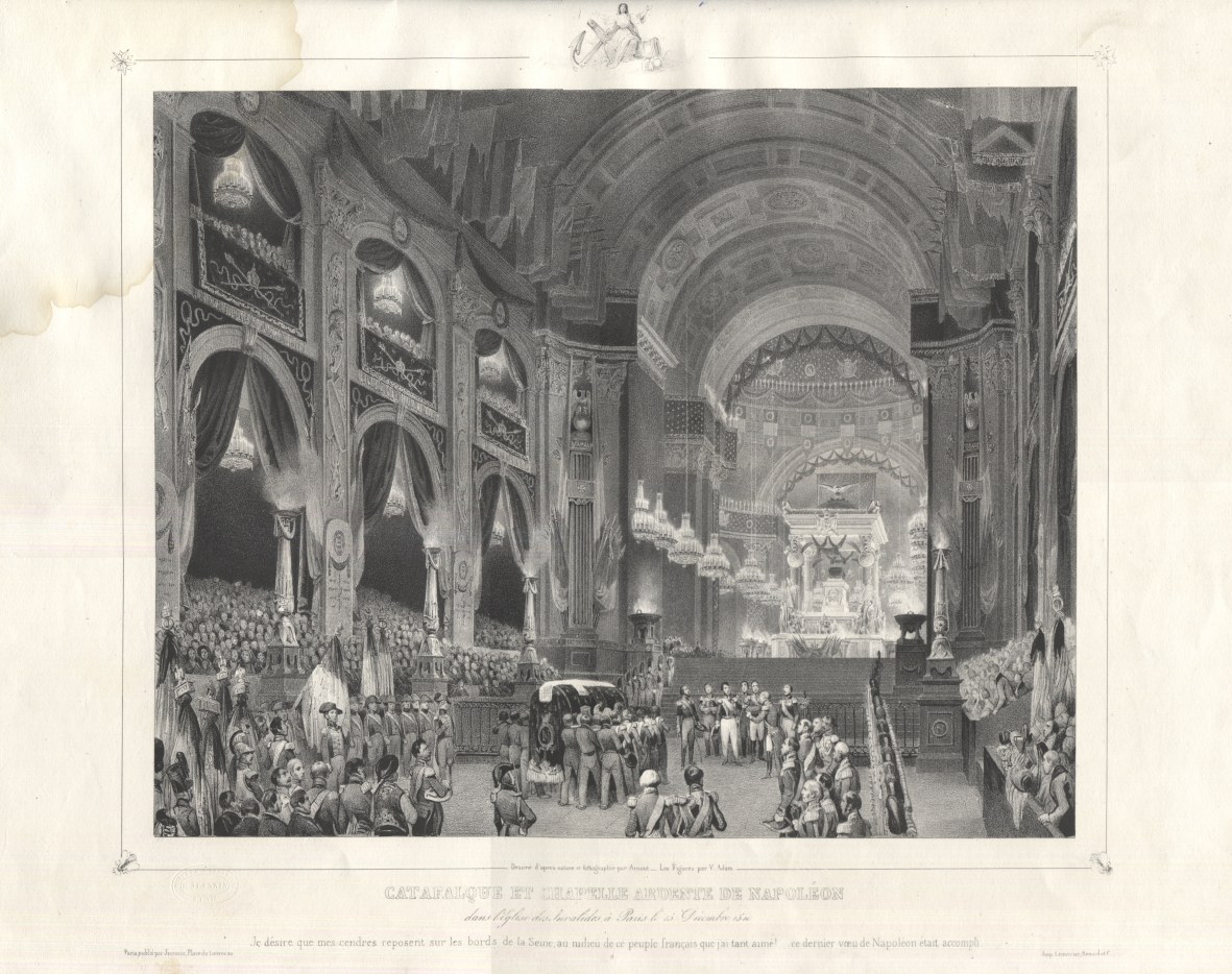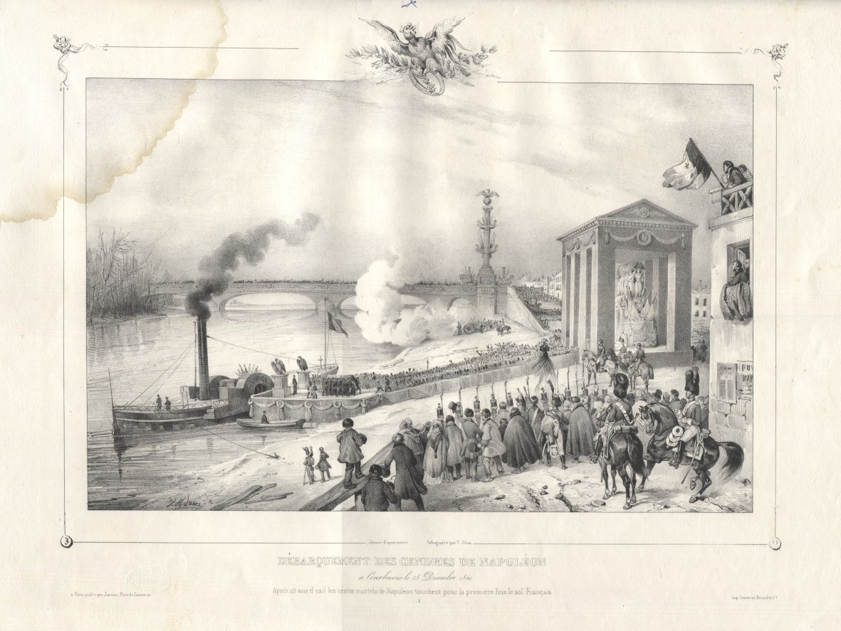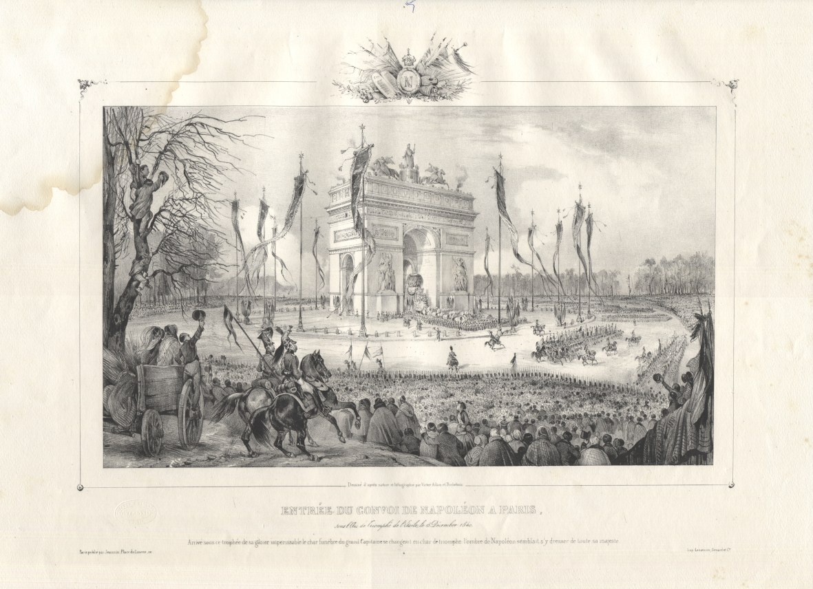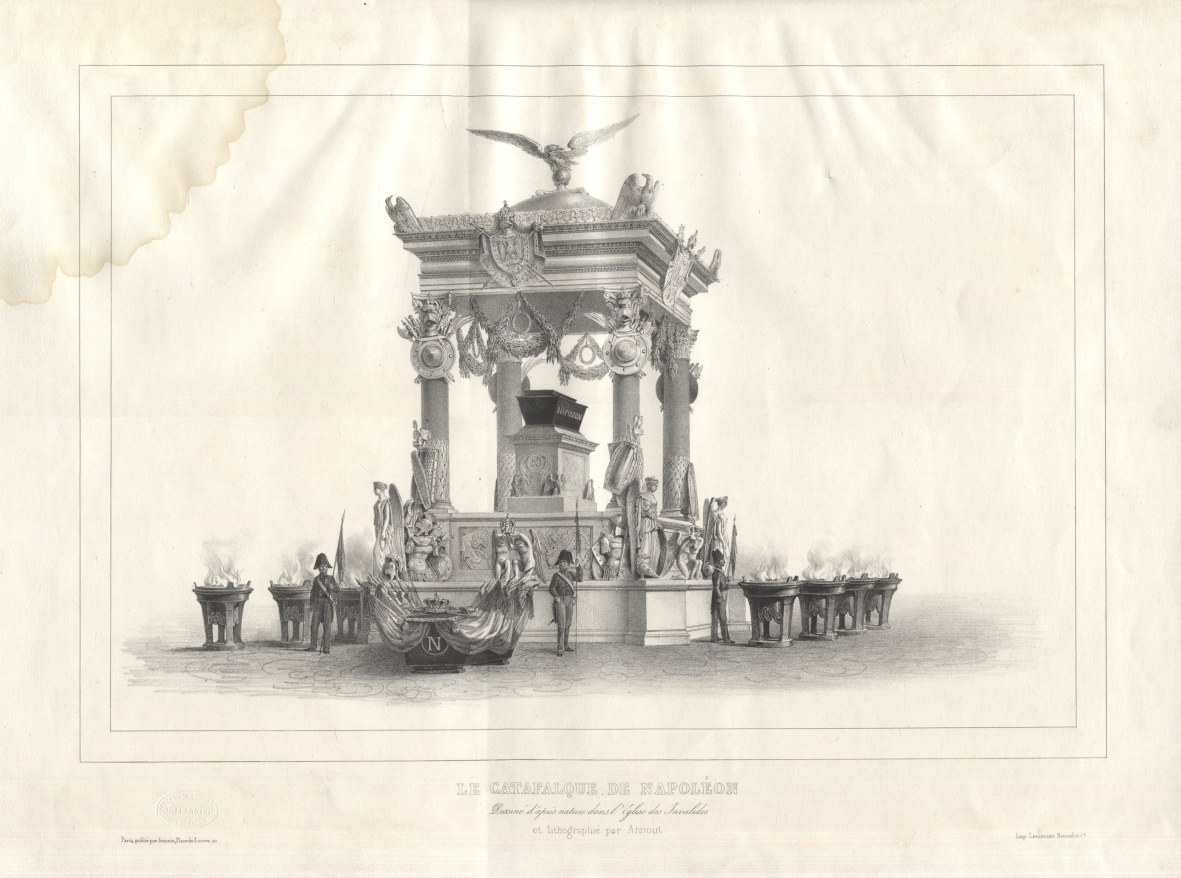 Powrót doczesnych szczątków Napoleona do Francji - efektowny album z wielkoformatowymi litografiami, wspólne dzieło uznanych artystów franc., grafiki wykonali : Jean Victor Adam (1801-1867), Jean Baptise Arnout (1788-1865) oraz Alphonse Bichebois (1801-1850). Poszczególne plansze przedstawiają kolejne etapy ostatniej podróży Napoleona : od pożegnania na Wyspie św. Heleny, przewiezienie trumny statkiem do Europy, po triumfalny przejazd i uroczystości pożegnalne w Paryżu. Opr. uszk. (brak grzbietu i otarcia), brak k. tyt. i 3 (?) tabl., ślad sporego zacieku na dolnym, lewym rogu (w większości na obszernych marginesach). Zbiory renomowanych bibliotek i muzeów (Bayerische Staatsbibliothek, Rijskmuseum) posiadają 11-12 plansz, Biblioteka Narodowa podaje k. [19] - bez szczegółowej specyfikacji zawartości.