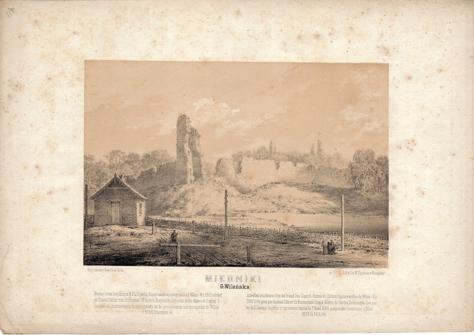 Miednyki (G.Wilenska). Niegdys letnia rezydencya W.X.L Olgierda. Ruiny zamku o cztery mile od Wilna. W r. 1385 zdobyl go Konrad Zelmer von Rotenstein W. Mistrz Krzyzacki. Od roku 1484 Marca 4 zwloki S. Kazimierza Jagelonczyka tu spoczywaly az do przeniesienia ich uroczyscie do Wilna r/ 1636 Sierpnia 14.