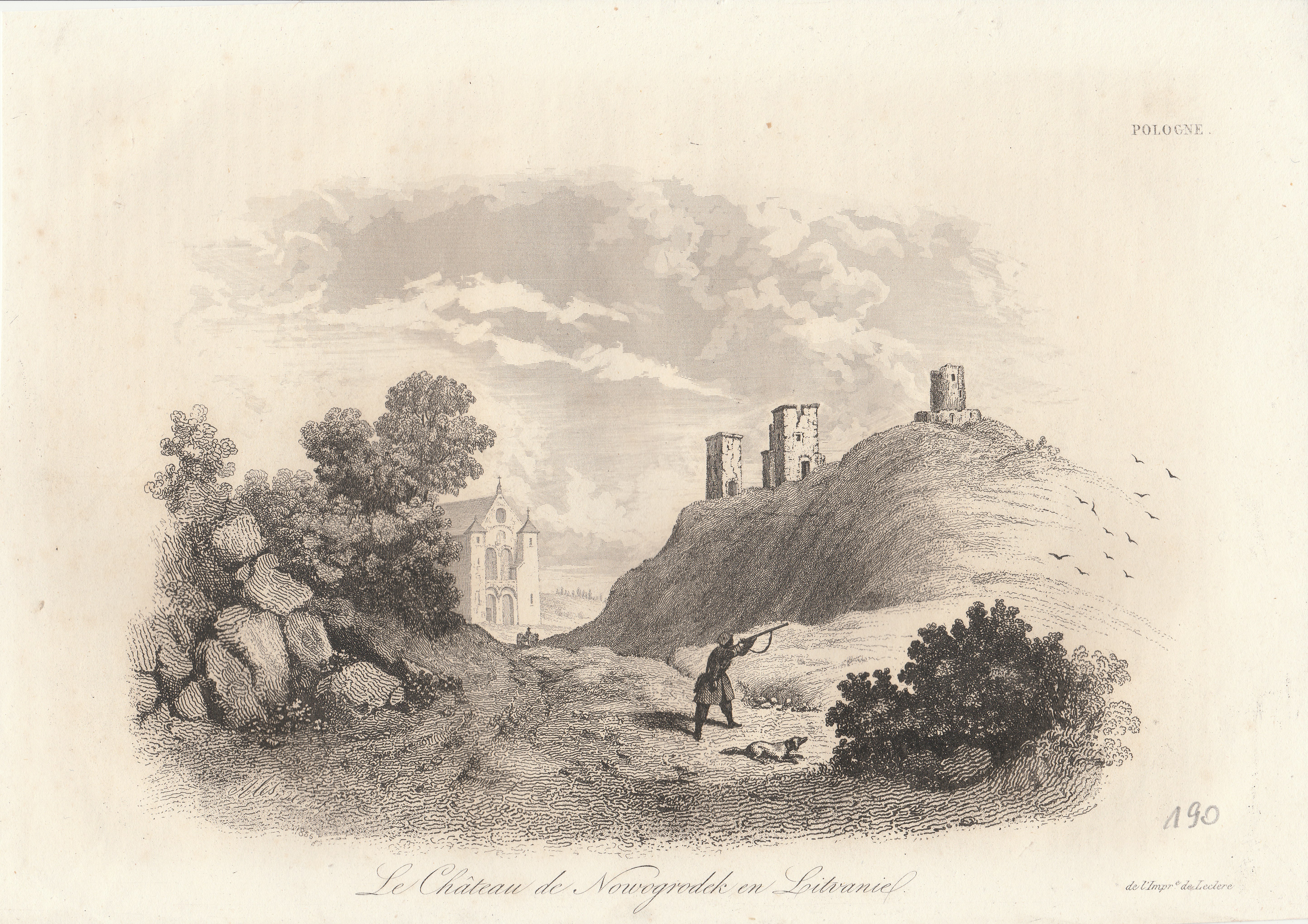 NOWOGRÓDEK. widok na zamek w Nowogródku na Litwie, druk. Leclere (sygn. na płycie Impr. de Leclere.), pochodzi z: dzieła: La Pologne historique, littéraire, monumetale et pittoresque... autorstwa Leonarda Chodźko, wyd. Bureau Central, Paryż 1835-1842, stal. cz.-b., st. db., wymiary arkusza: ok. 245x175 mm; La chateau de Nowogrodek en Litvanie.
