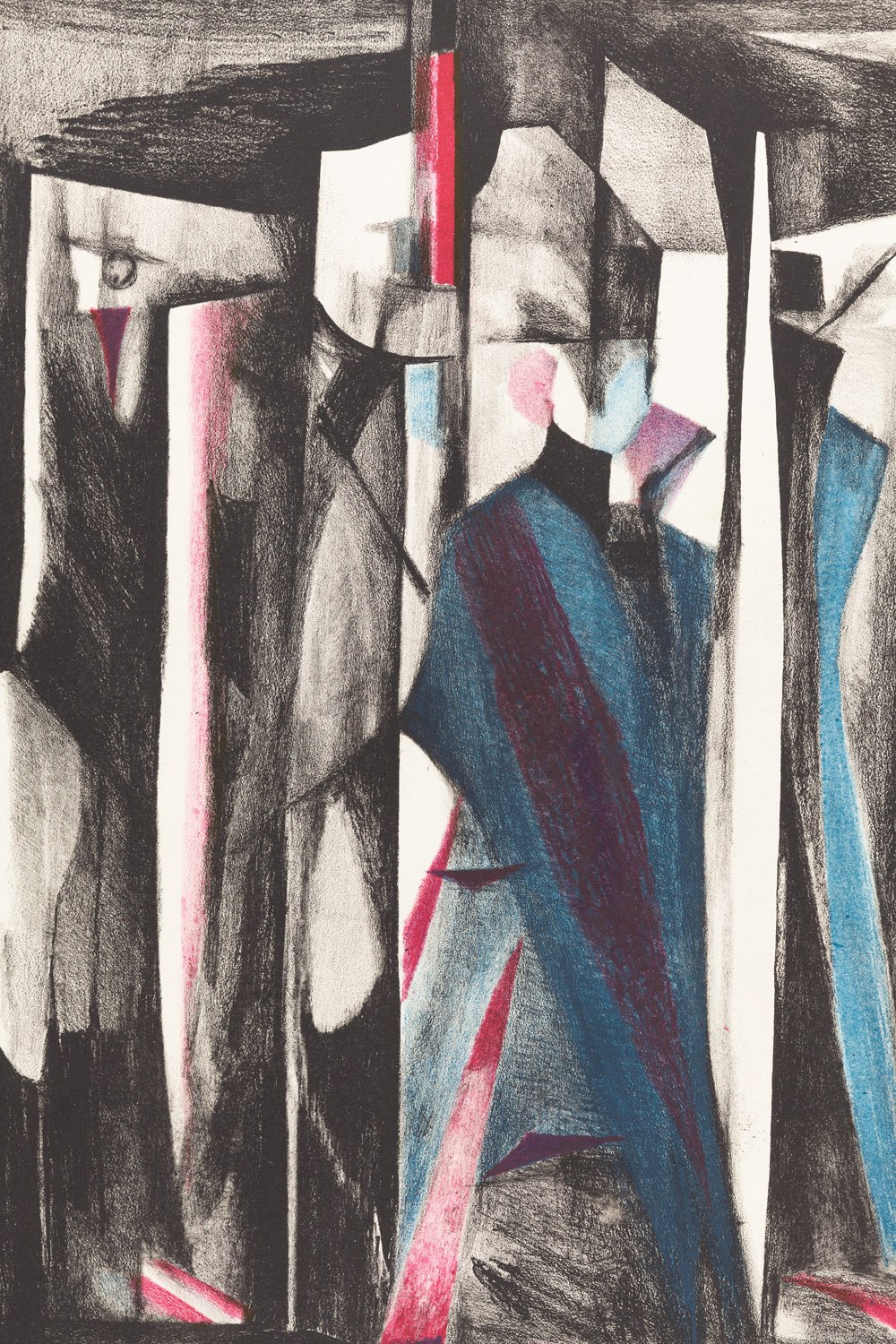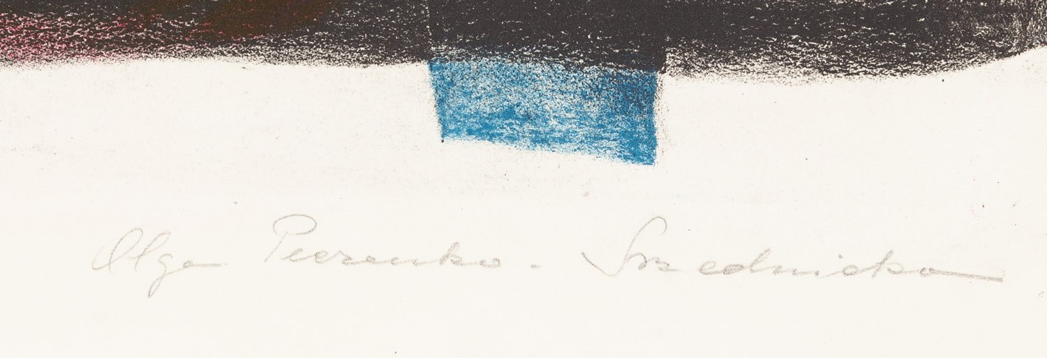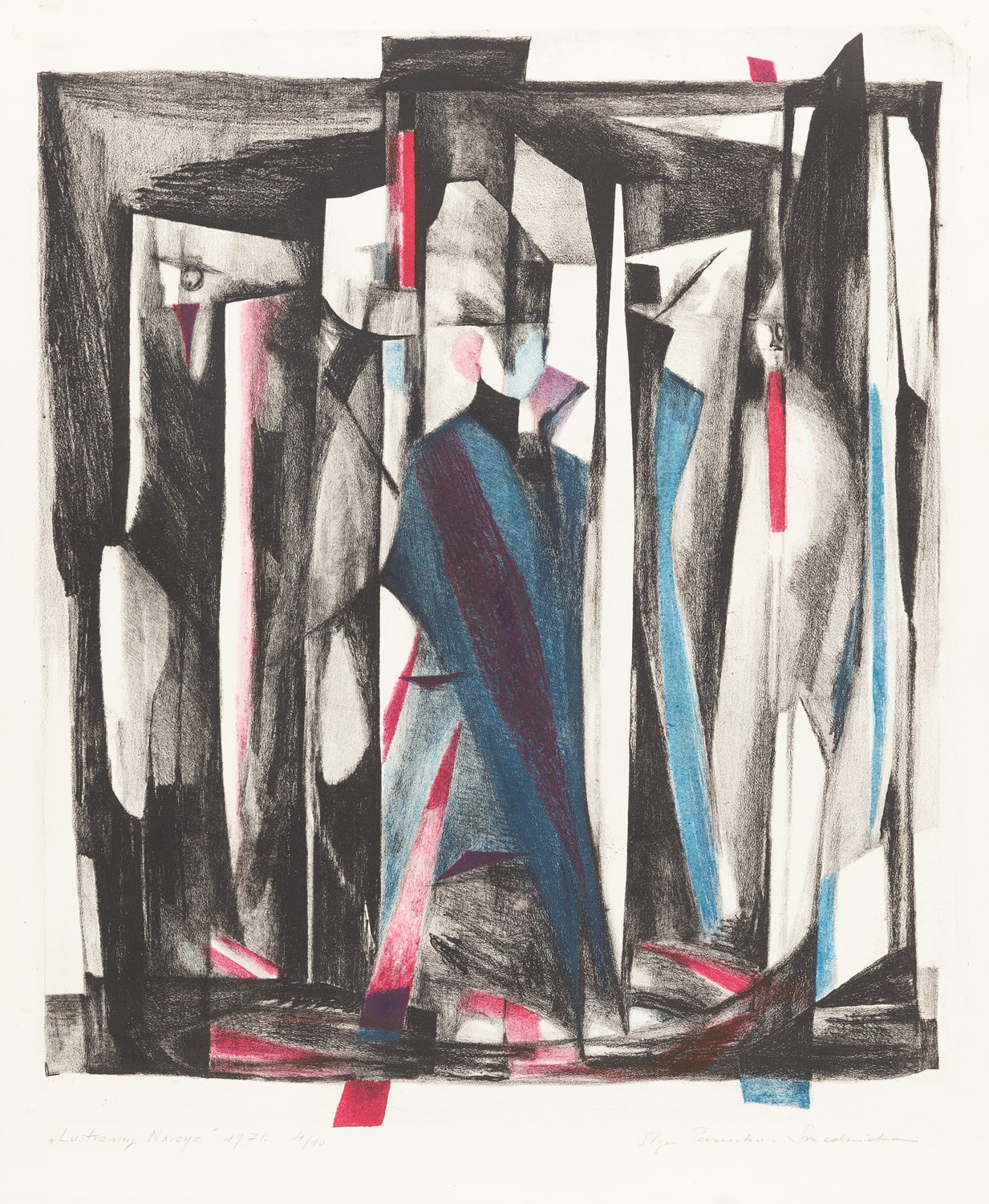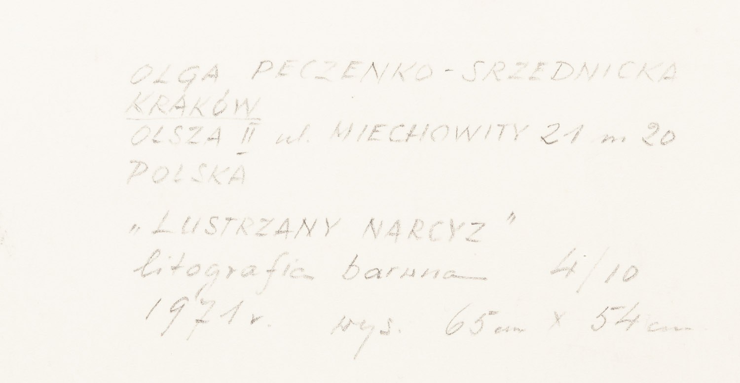 opisany ołówkiem na odwrociu: ‘OLGA PACZENKO SRZEDNICKA | KRAKÓW | [DANE ADRESOWE] | „LUSTRZANY NARCYZ” | Litografia barwna 4/10 | 1971 wys. 65 cm x 54 cm’