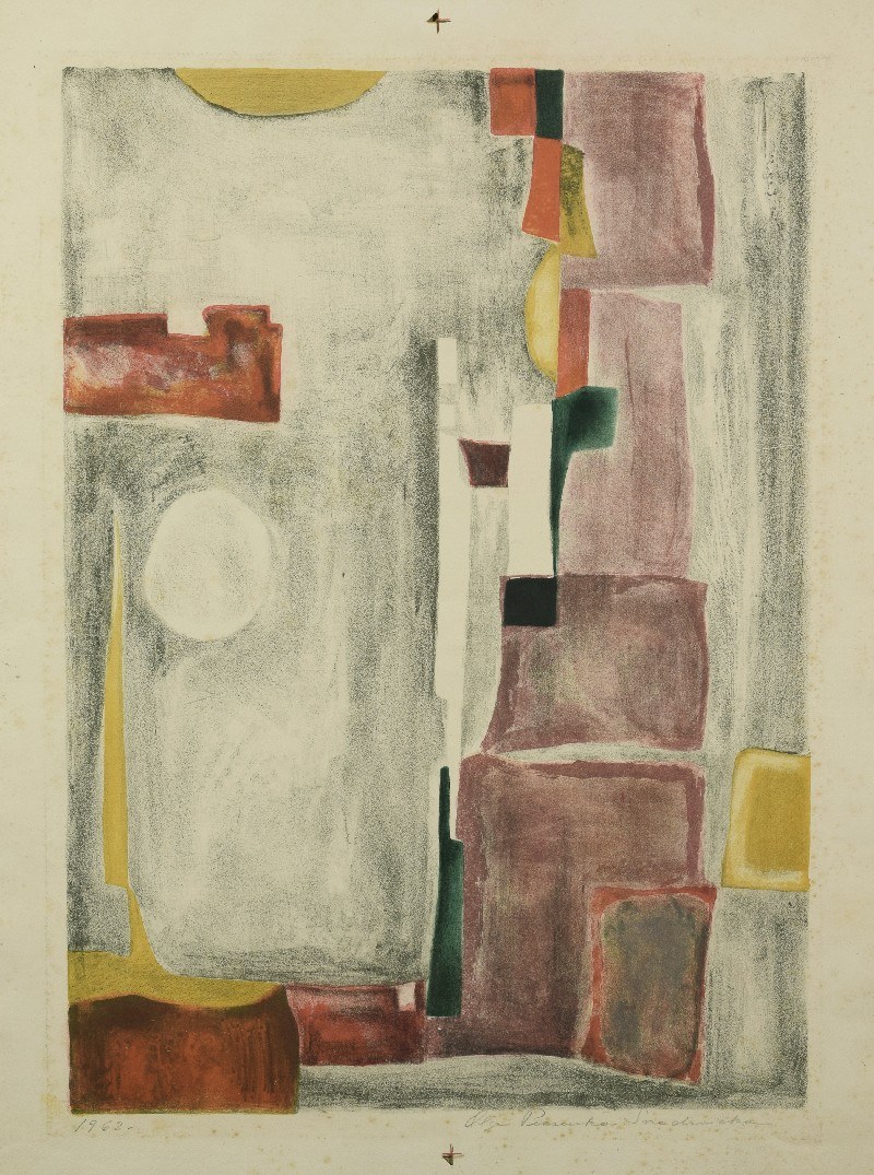 3. Etiuda - litografia, papier naklejony na szary papier; 62 x 49 cm (wymiar arkusza); sygn. p. d.: Olga Peczenko - Srzednicka (ołówkiem); data l. d.: 1962 r (ołówkiem); na odwrocie opis autorski;