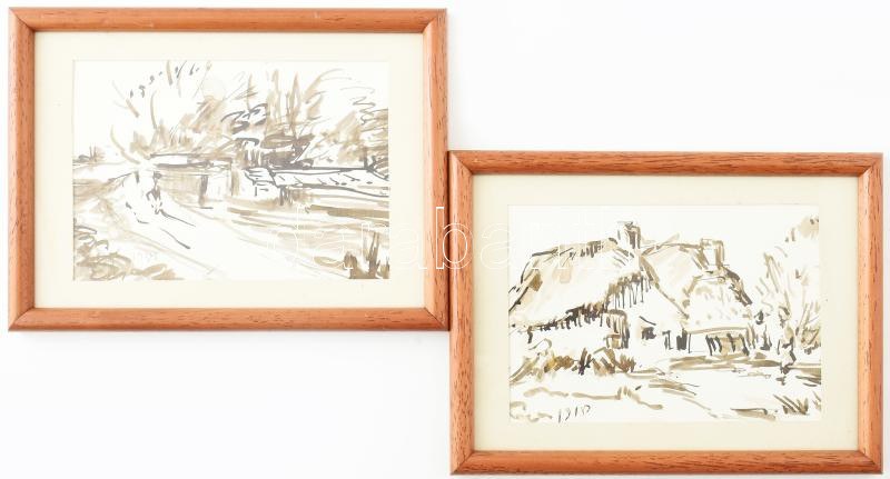 Olvashatatlan héber jelzéssel, 2 db rajz: Táj és házak. Tus, papír. Üvegezett fakeretben. 10x14 cm.