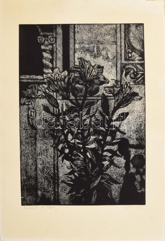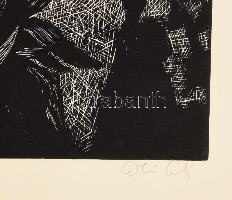 Olvashatatlan jelzéssel: Csendélet és szekrény. Fametszet, papír, jelzett, kartonra kasírozva, lap széle kissé foltos...