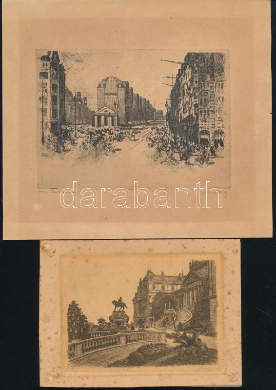 Olvashatatlan jelzéssel, klf. alkotók, 3 db rézkarc, 1910-40 körül: Vajdahunyad, Bp.; Budai várpalota és ismeretlen nagyvárosi utca . Rézkarc, papír, foltos, 9x12 és 10x14 cm közötti méretekben