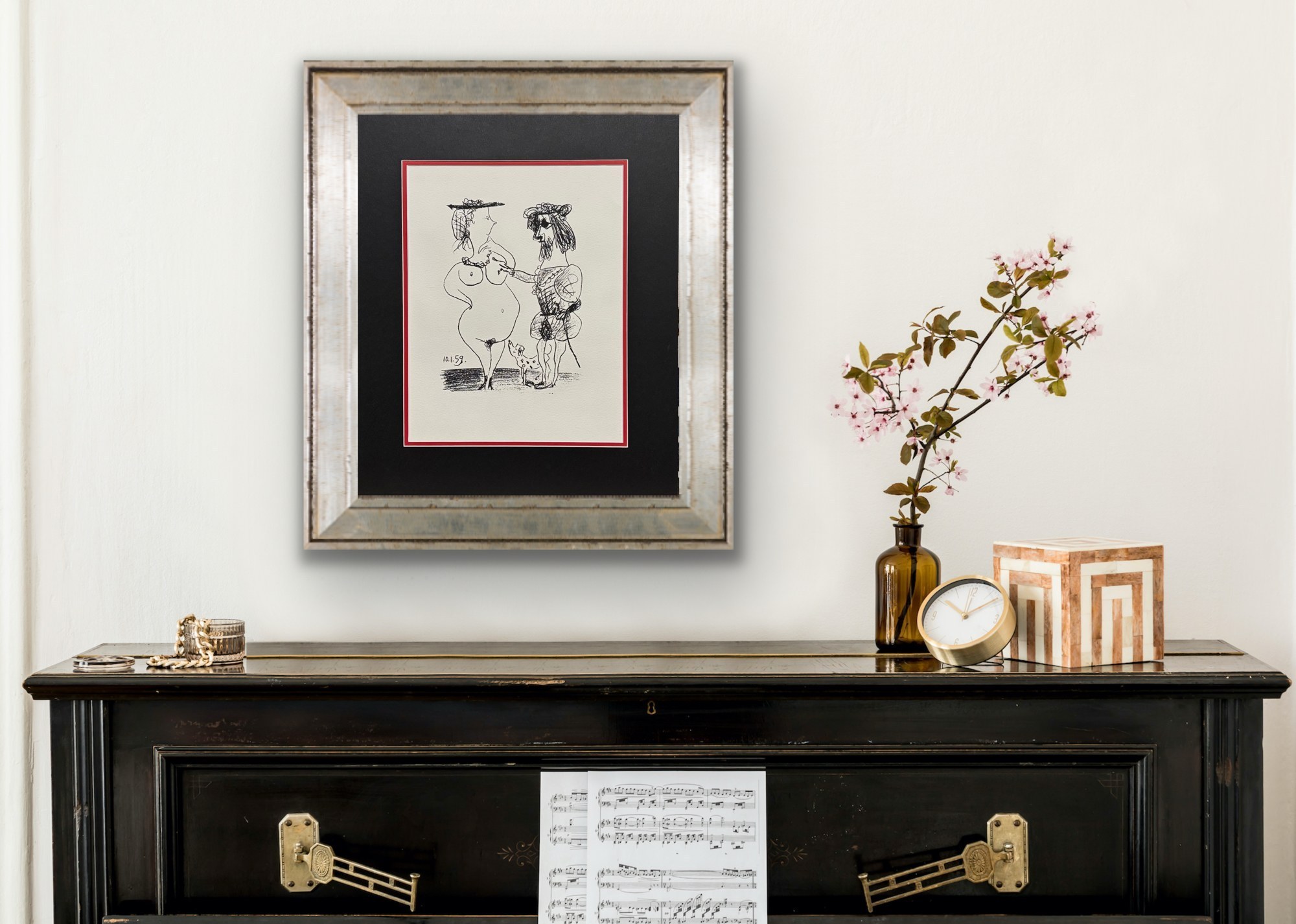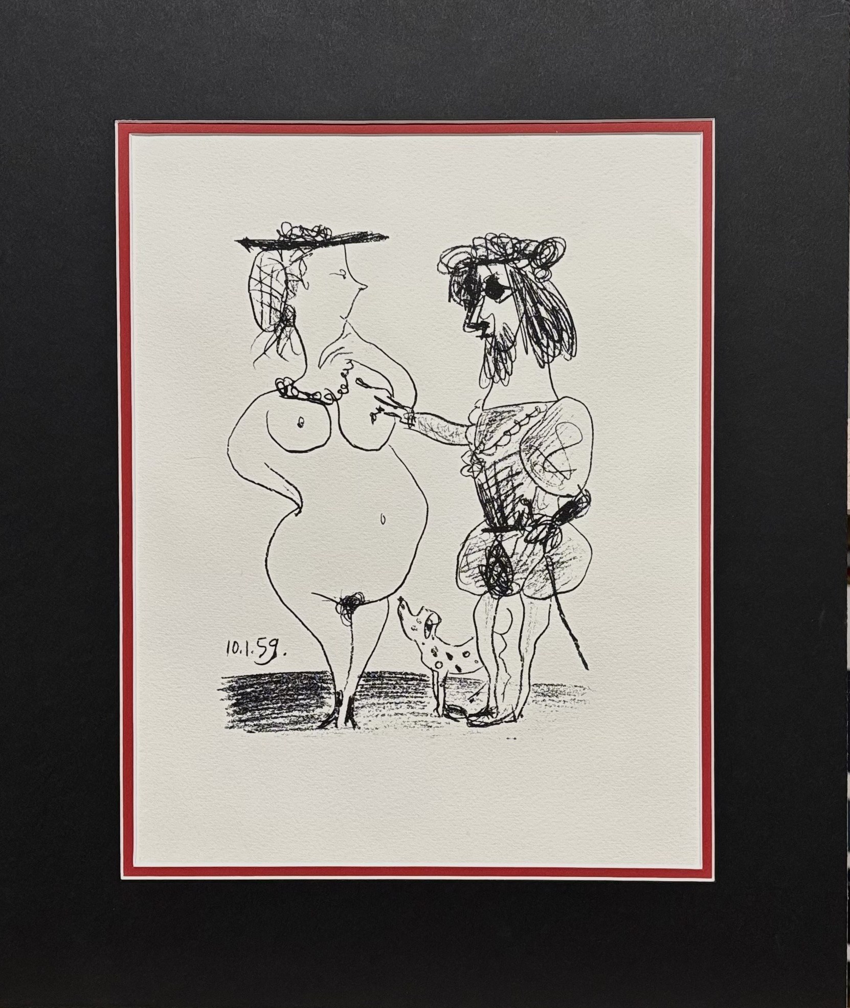 Rzadka, oryginalna litografia z cyklu „Wspomnienia i portrety artystów” pod redakcją Alaina C. Mazo, Paryż i Léona Amiela, Nowy Jork, 1972, na papierze Arches; wymiary: 31 x 25 cm w świetle passe-partout o wym. 44 x 36 cm ; data 10.1.59 l.d.; na odwrocie pieczątka potwierdzająca autentyczność: PABLO PICASSO Le Seigneur et la Dame (M. 322) Lithographie oryginale; Wydawca Atelier Mourlota. Oryginalny certyfikat.