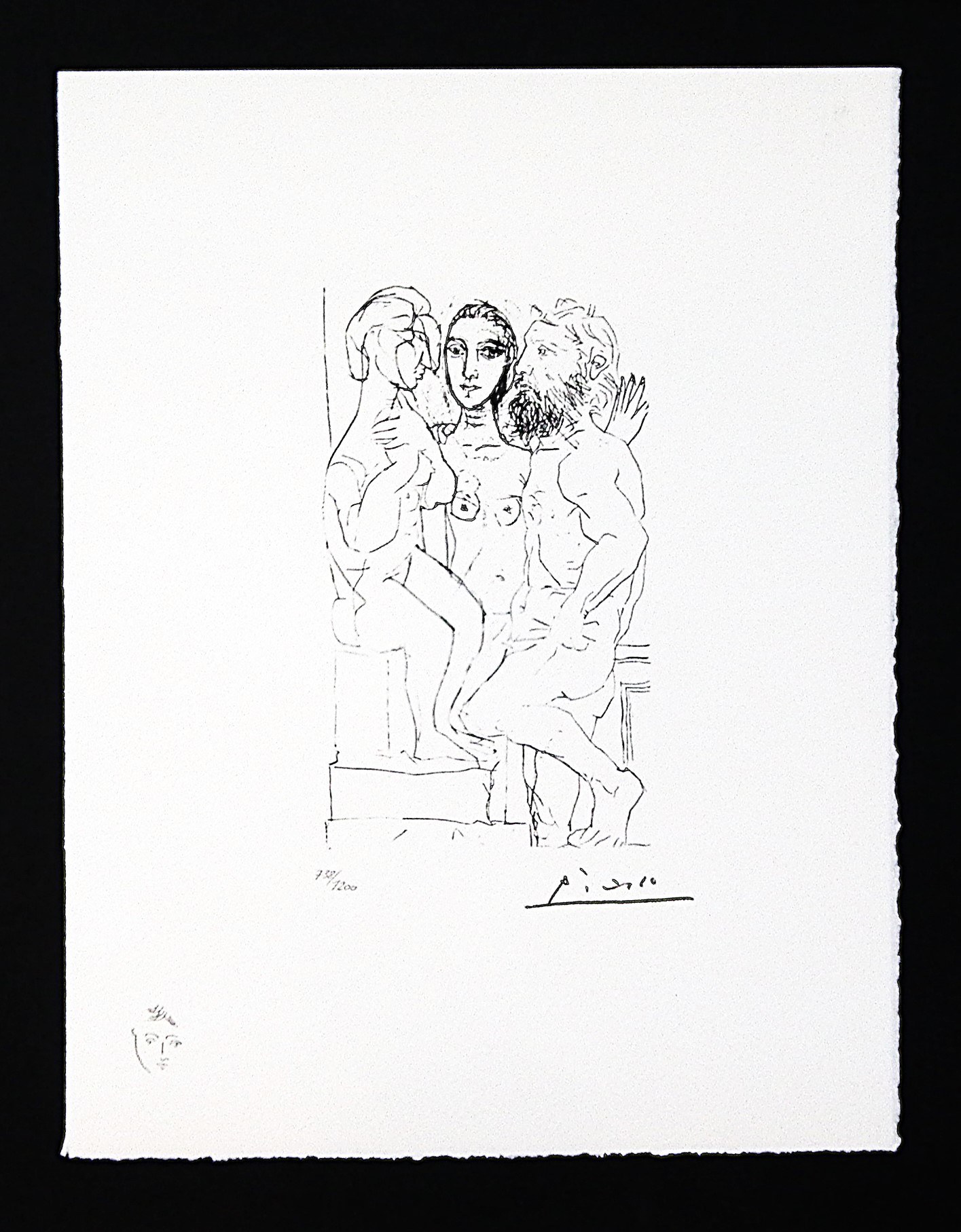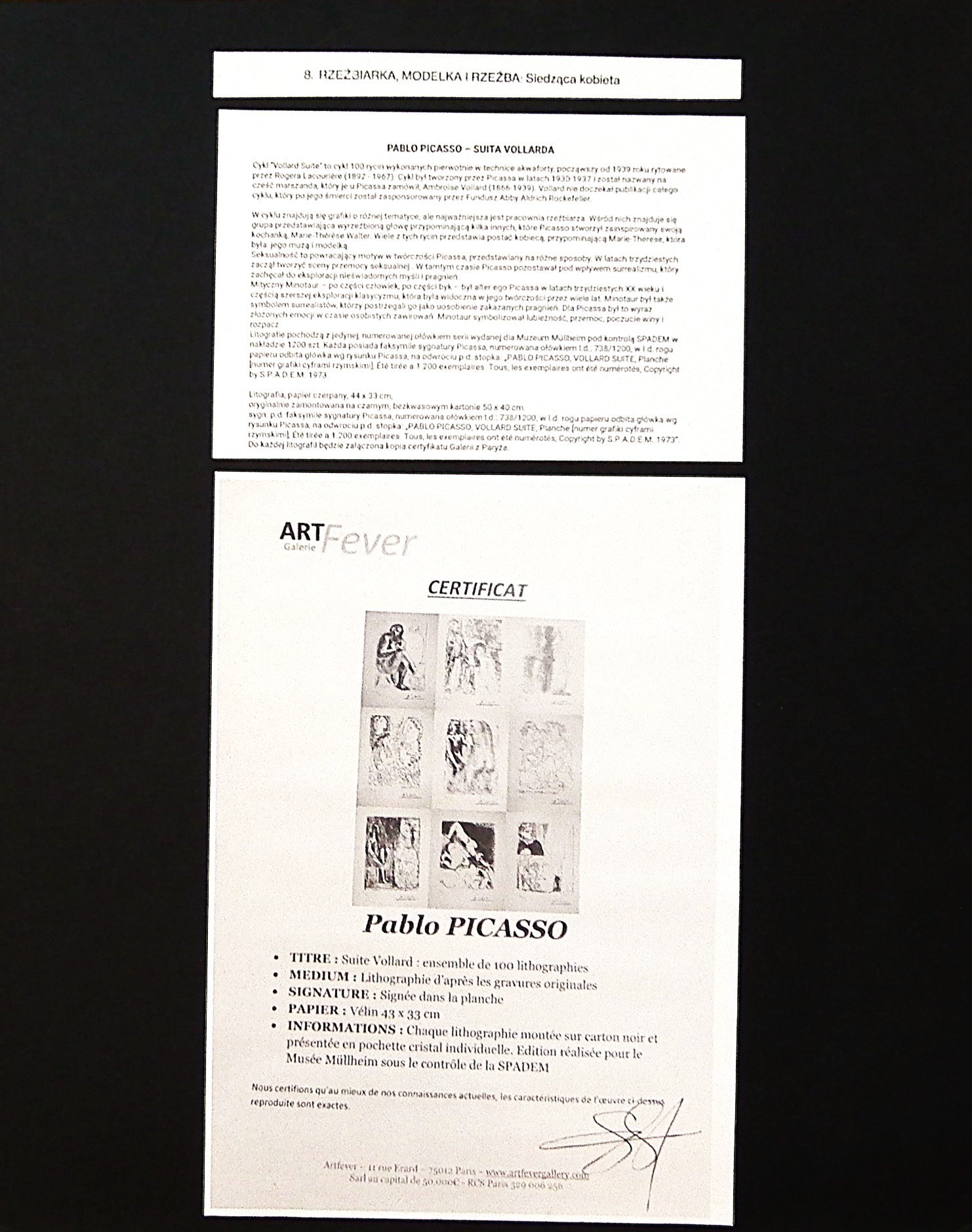 litografia, papier czerpany, 44 x 33 cm; oryginalnie zamontowana na czarnym, bezkwasowym kartonie 50 x 40 cm;, sygn. p. d. faksymile sygnatury Picassa, numerowana ołówkiem l. d.: 738/1200, w l. d. rogu papieru odbita główka wg rysunku Picassa,, na odwrocie p. d. stopka: PABLO PICASSO, VOLLARD SUITE, Planche [numer grafiki cyframi rzymskimi], Été tirée a 1.200 exemplaires. Tous, les exemplaires ont été numérotés, Copyright by S.P.A.D.E.M. 1973.Litografie pochodzą z jedynej, numerowanej ołówkiem serii wydanej dla Muzeum Müllheim pod kontrolą SPADEM w nakładzie 1200 szt. Oryginalny certyfikat.