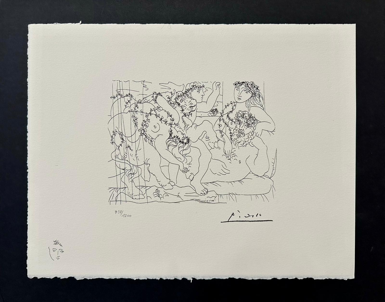 Sygn. p. d.: faksymile sygnatury Picassa, numerowana ołówkiem l. d.: 738/1200, w l. d. rogu papieru odbita główka wg rysunku Picassa, na odwrociu p. d.: stopka: PABLO PICASSO, VOLLARD SUITE, Planche [numer grafiki cyframi rzymskimi], Été tirée a 1.200 exemplaires. Tous, les exemplaires ont été numérotés, Copyright by S.P.A.D.E.M. 1973. Faksymile certyfikatu z galerii w Paryżu.
