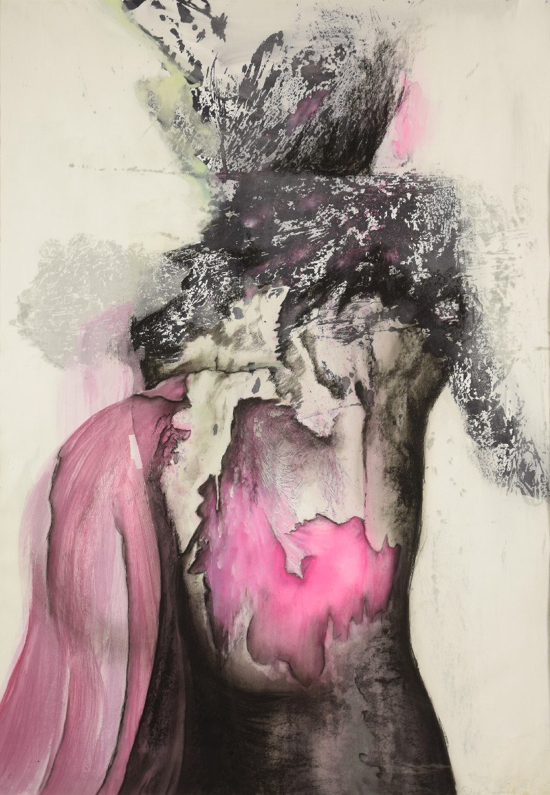 technika własna (akryl, węgiel, atrament), papier; 100 x 70 cm;