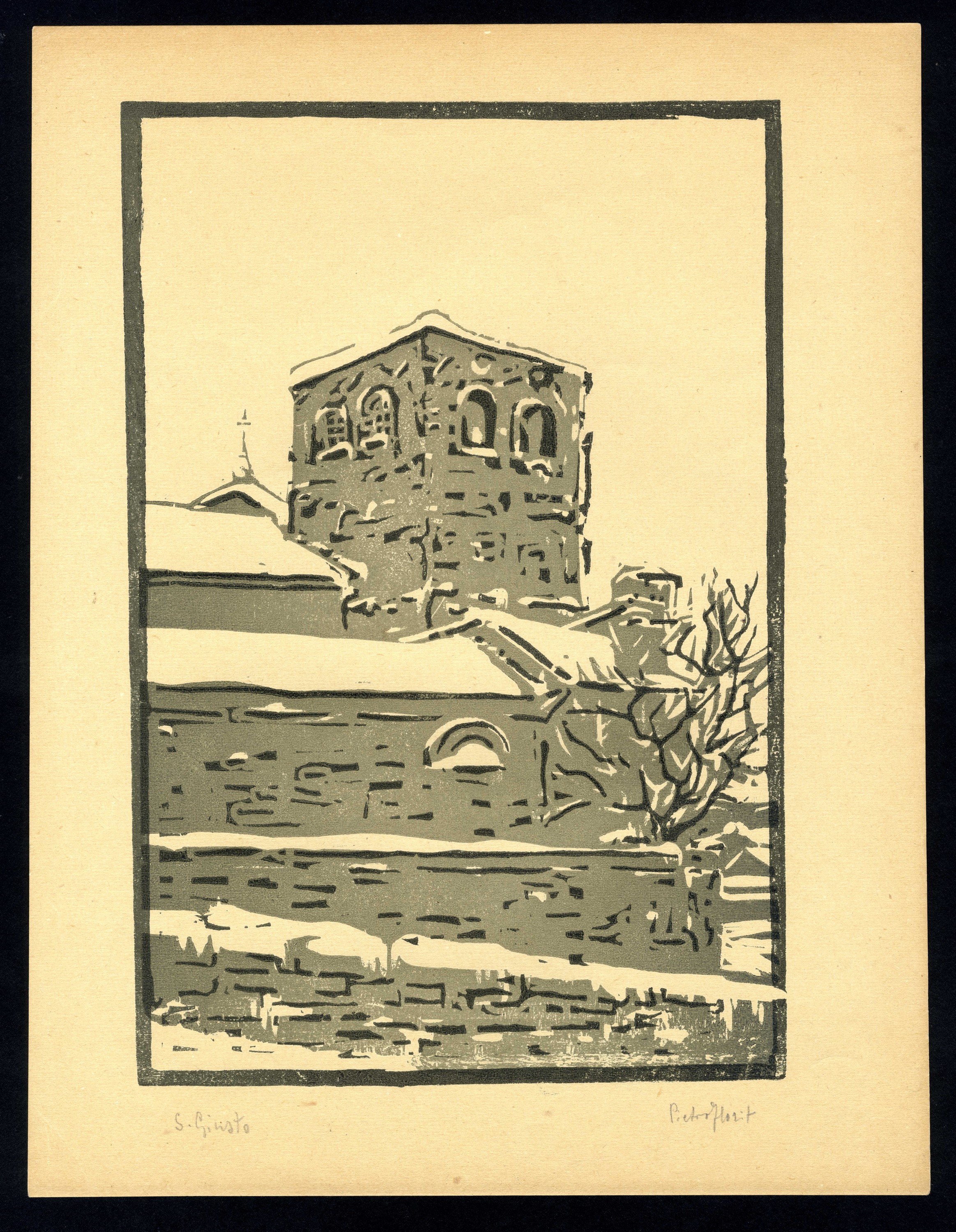 two-color woodcut; cm. 23.7x30.3. Glimpse of the town of S. Giusto, with the bell tower of the Cathedral under the snow, delicately rendered by the chromatic use of the woodcut sign of the two colors and the third created by subtraction. Exemplary in very good condition.