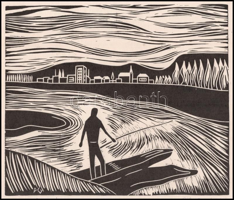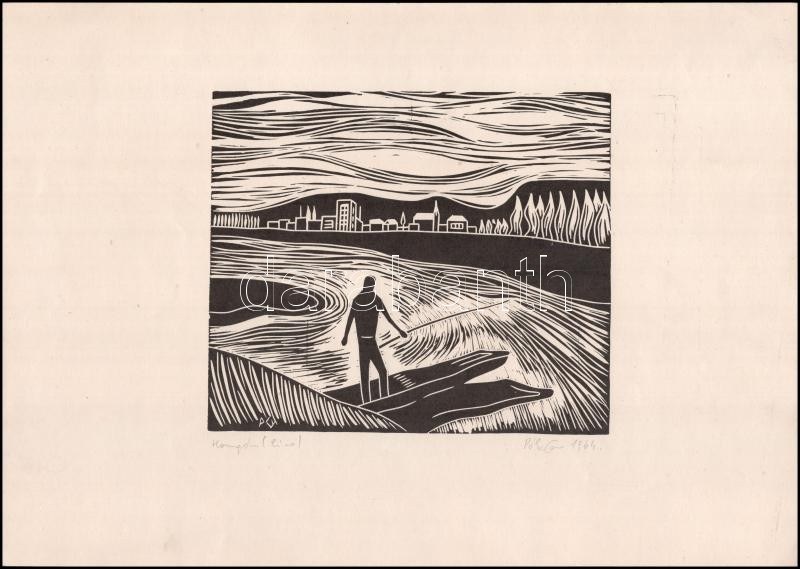 Póka György (1944 - ): Horgász. Linómetszet, papír. Jelzett, 18x21 cm