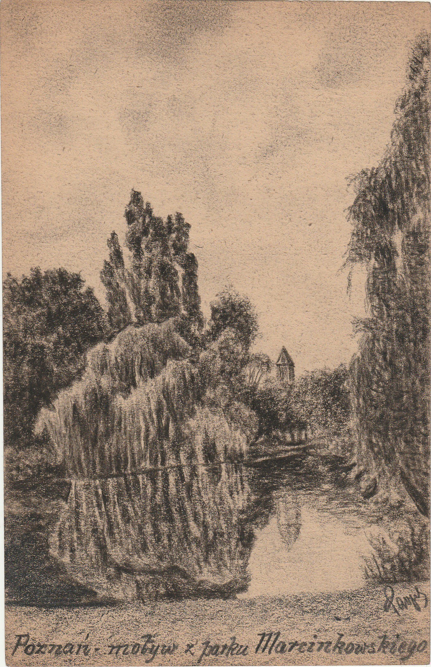 POZNAŃ. Widok na park Marcinkowskiego, rys. ołówkiem autorstwa M. P ...