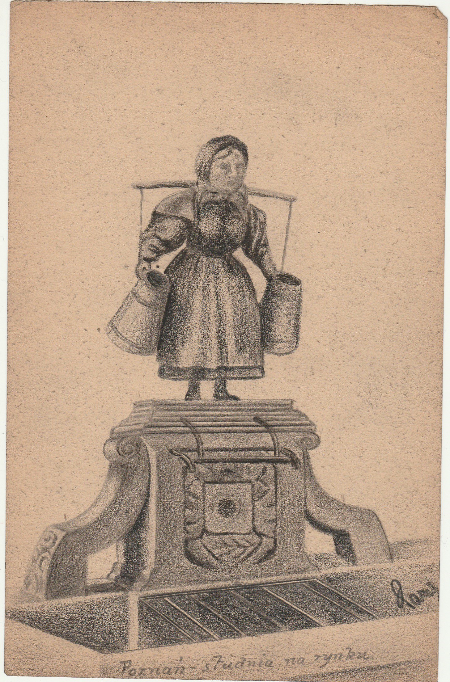 POZNAŃ. Widok na studnię na rynku, rys. ołówkiem autorstwa M. Pasz ...