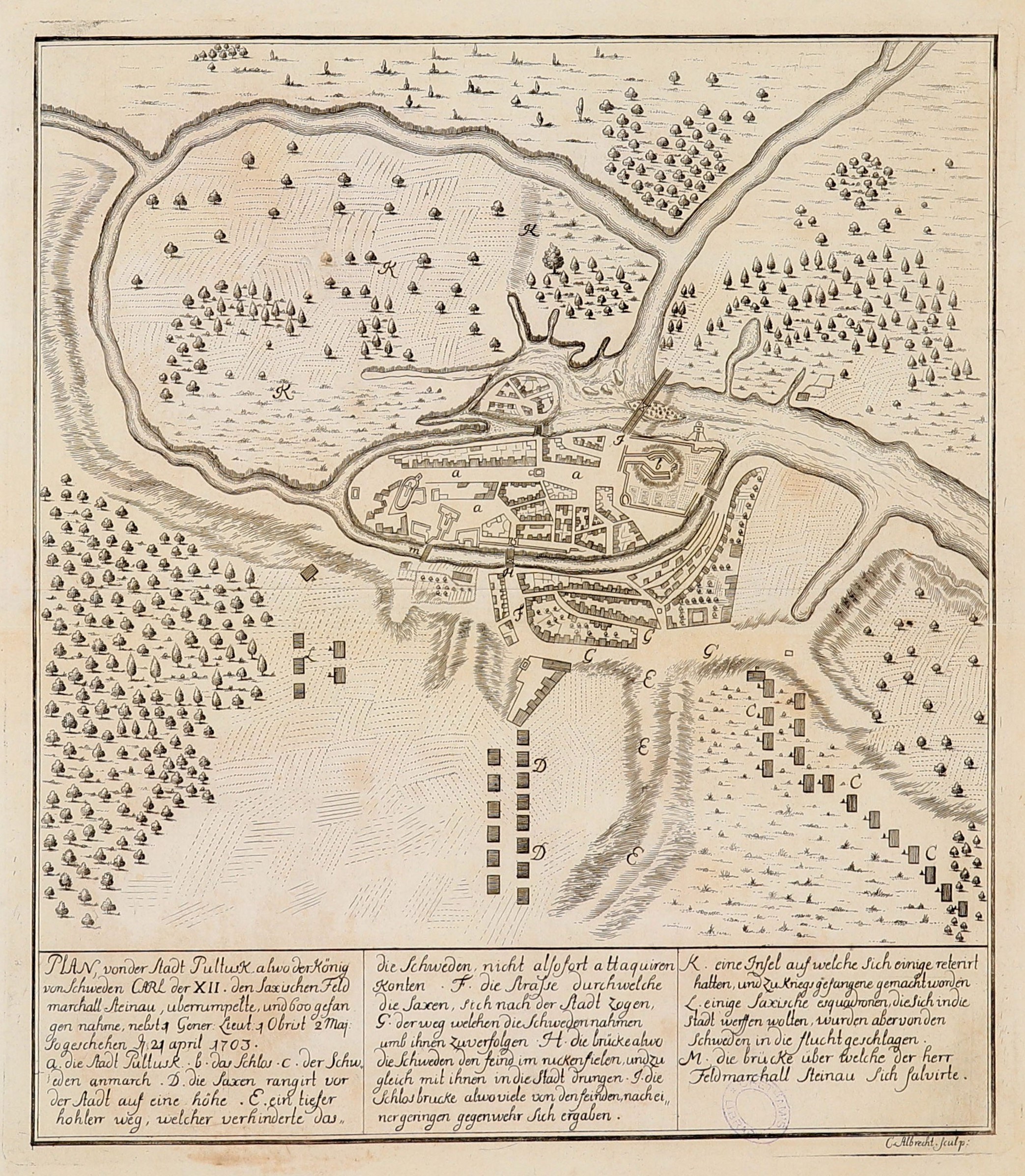 PUŁTUSK. Plan bitwy wojsk szwedzkich i saskich pod Pułtuskiem (V 1703) w czasie III wojny północnej; w dole opis; ryt. C. Albrecht, pochodzi z: Theatrum Europaeum, wyd. M. Merian, 1718; miedz. cz.-b., st. bdb., naddarcia, zażółcenia; wym. płyty 260x293 mm; Plan, von der Stadt Pultusk alwo der König von Schweden [...].