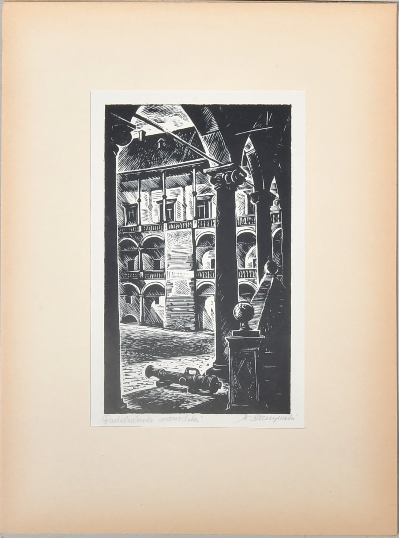 Drzeworyt, papier; 14 x 18 cm (w św. passe-partout). Sygn. p. d.: St. Raczyński, opisany autorsko l. d.: Dziedziniec wawelski. Stan bardzo dobry.