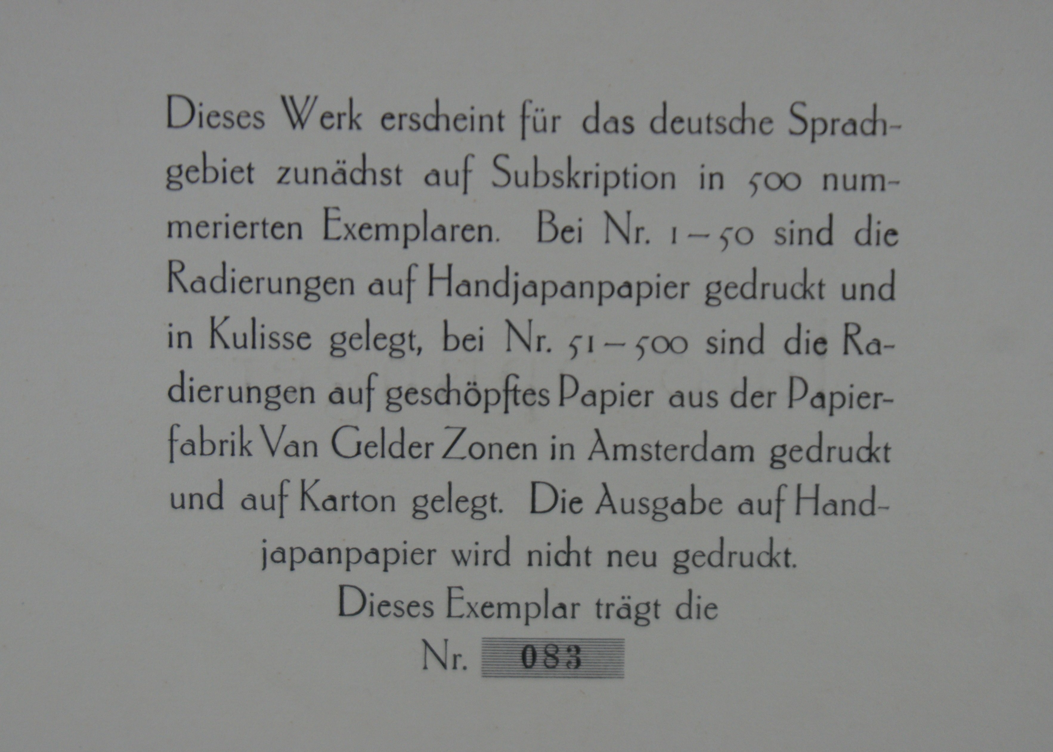 Wydanie na rynek niemiecki z okazji dwusetnej rocznicy śmierci artysty i ojca sztuki graficznej w technice Akwaforta . Praca została wydana w tece graficznej o nakładzie 500 sztuk i numerowanej, ten egzemplarz pochodzi z teki o nr. 083 z 1870 roku.Stan: bardzo dobry ,lekko pożółkły papier, nie oprawiany, zamontowany na oryginalnej planszy z teki.