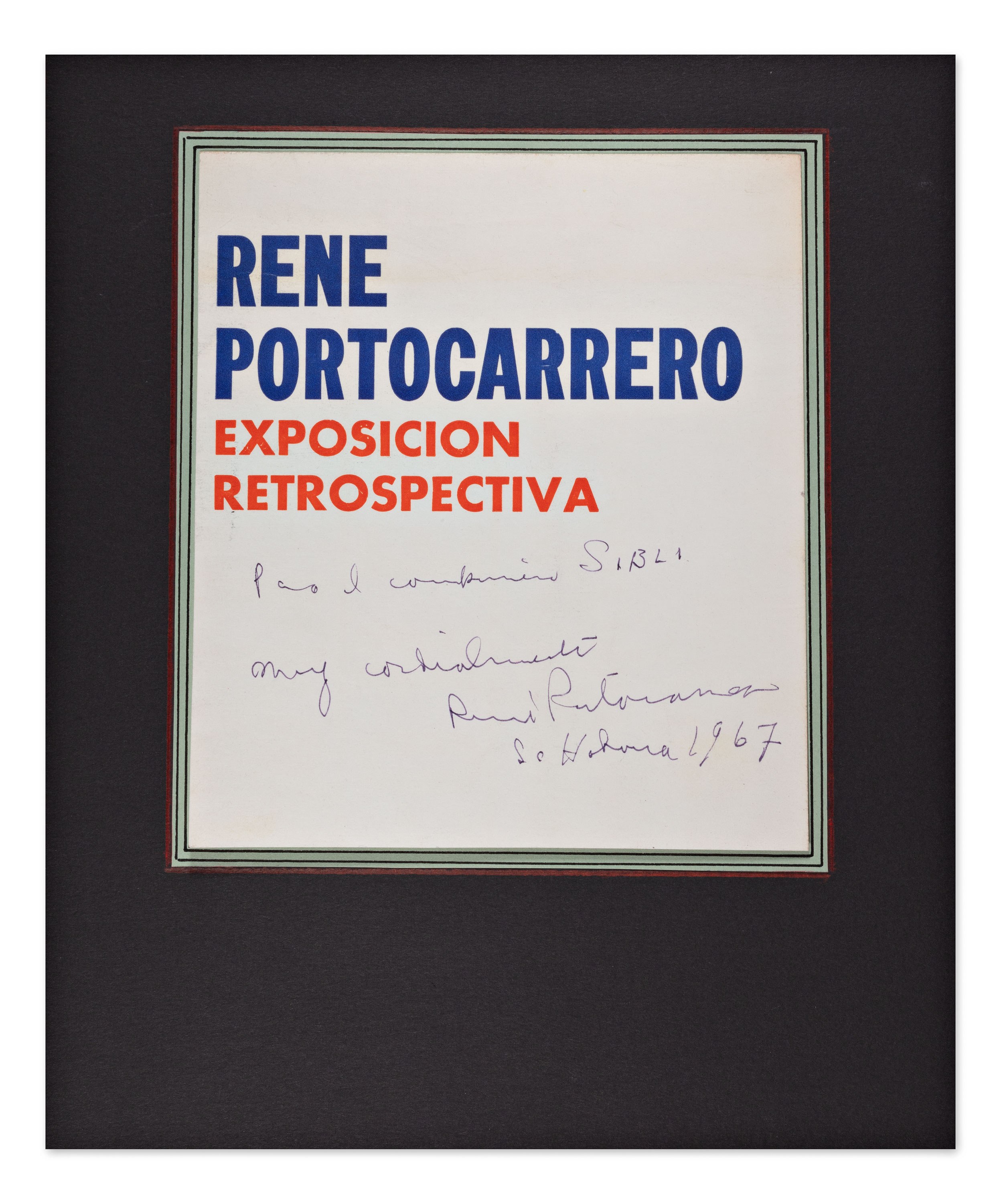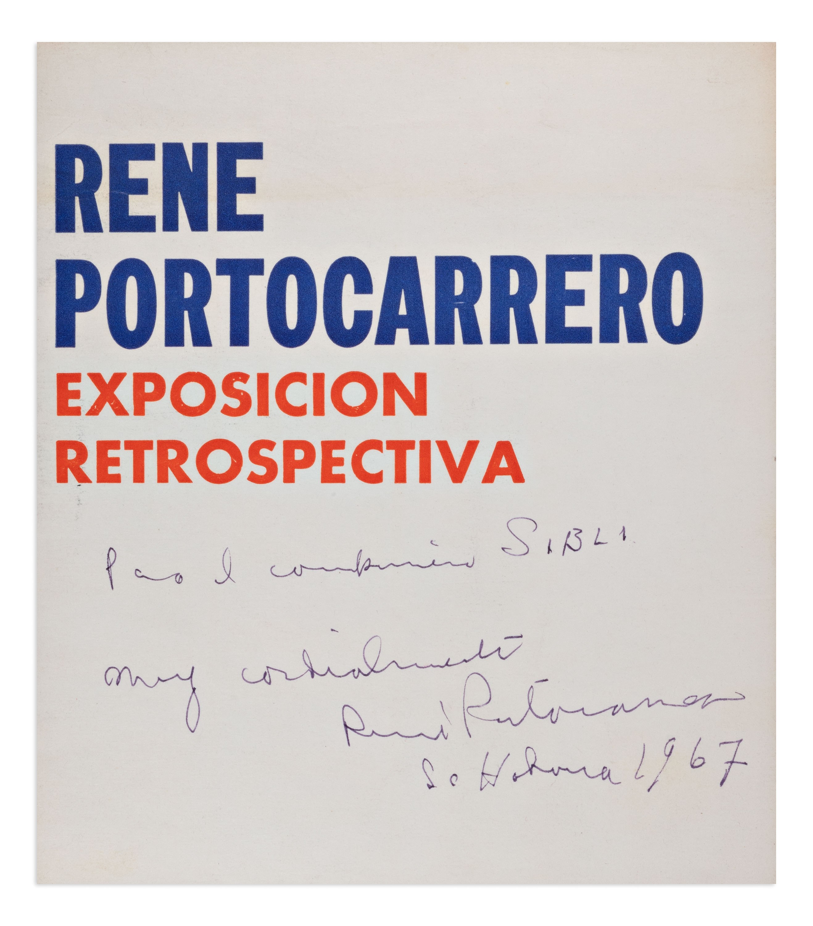Exhibition catalog cover of René Portocarrero's show, titled Exposición Retrospectiva, with the author's handwritten dedication and signature. The dedication, addressed to Dr. Siblík, is dated 1967, Havana.Text in Spanish: "Para el compañero Siblík. Muy cordialmente, René Portocarrero La Habana 1967."