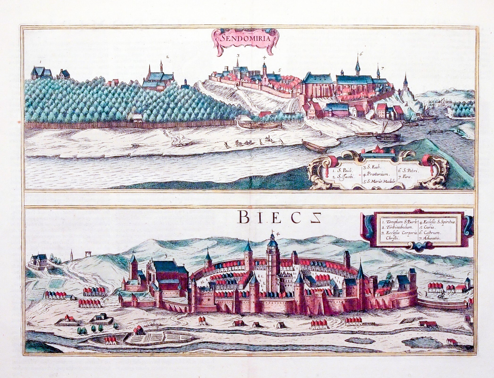 SANDOMIERZ, BIECZ. Panoramy miast na wspólnym arkuszu (odbite z 1 płyty); na verso teksty w jęz. łac.: SENDOMIRIA; BIETSAE DESCRIPTIO; BIETSA; verso w 2 miejscach podklejone papierem, naddarcia krawędzi; wym. płyty: 445x322 mm; tyt. widoku Sandomierza w kartuszu, pod górną ramką: SENDOMIRIA; tyt. widoku Biecza pod górną ramką, bez kartusza: BIECZ (litera Z w lustrzanym odbiciu); [Imago Poloniae... K103/4, Dantiscum... G65/4]