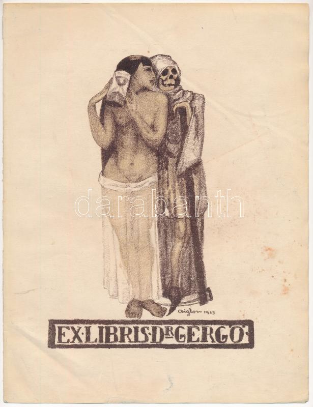 Sassy Attila (1880-1967): Ex libris dr. Gergő, 1913. Litográfia, papír. jelzett a litográfiánn (Aiglon és Sassy). Lap széle kissé foltos. Hajtásnyommal. 20x14 cm. Ritka!