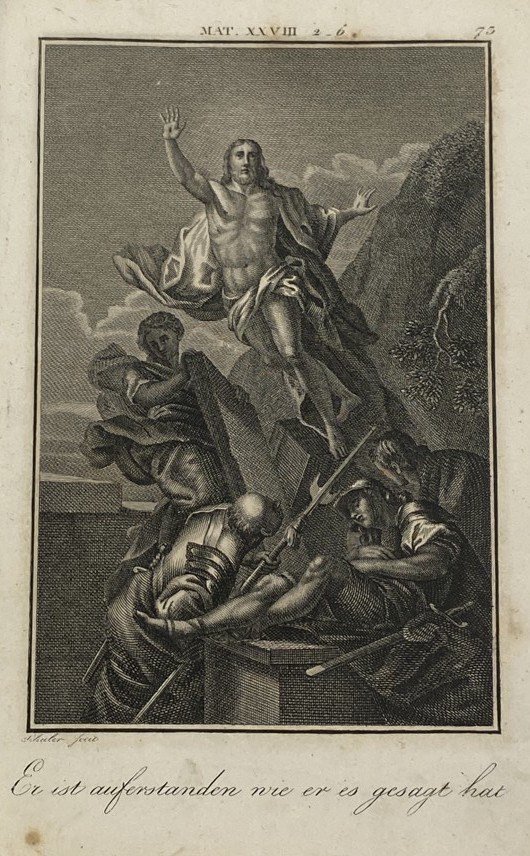 "Er ist auferstanden wie er es gesagt hat", ilustracja z "Biblii w obrazkach" wydanej w połowie XIX wieku, miedzioryt, wymiary ryciny ok. 9 x 14 cm, na papierze o wymiarach ok. 11,5 x 18 cm, niewielkie zabrudzenia