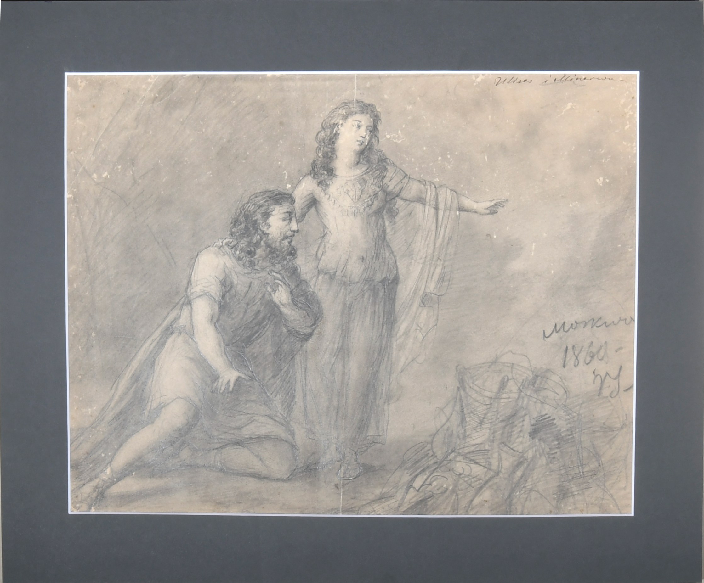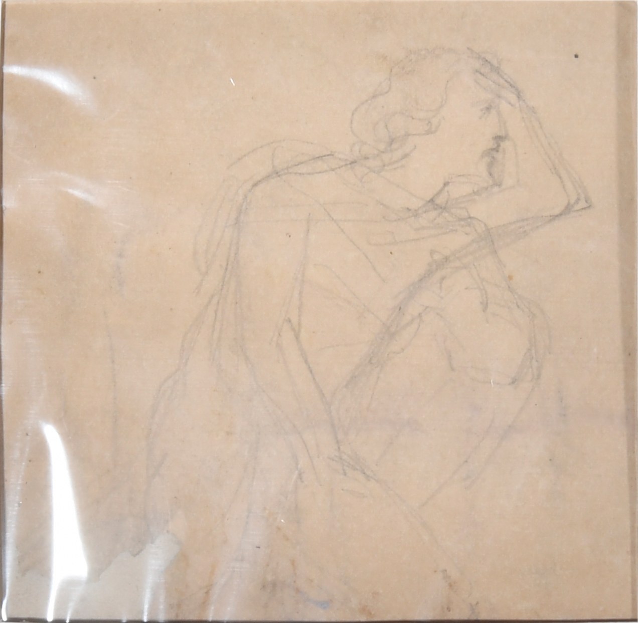 Ołówek, papier. Wym.: 37,5 x 29 cm (w świetle passe-partout). Pionowe zagięcie, poza tym stan dobry. Na odwrociu szkic ołówkiem. Rzadkie.