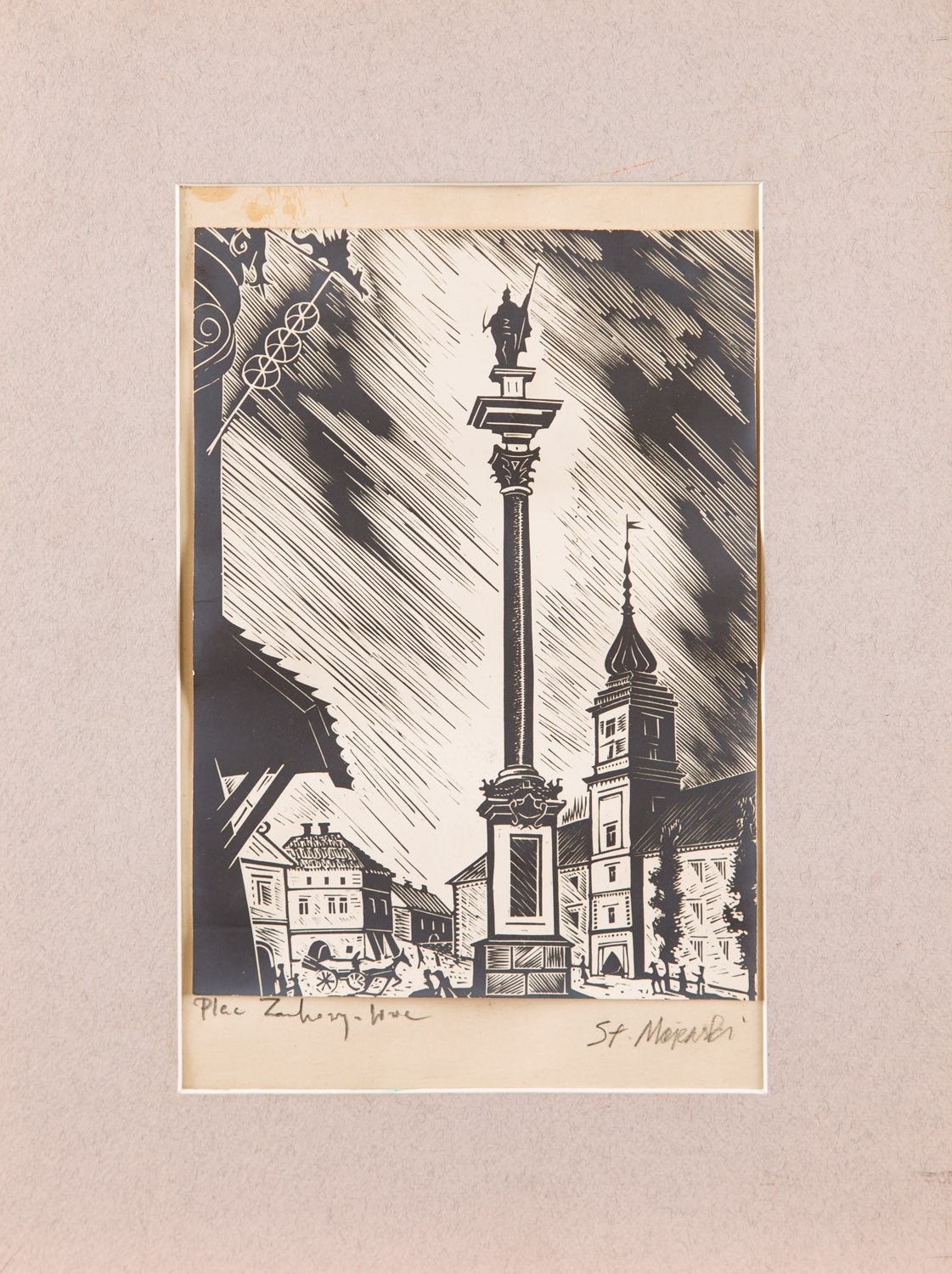 drzeworyt, papier (fotograficzny?) naklejony na karton, 23,5 x 17,5 cm (wymiary arkusza); opisany i sygn. u dołu: Plac Zamkowy - Wwa St. Majewski; bez oprawy