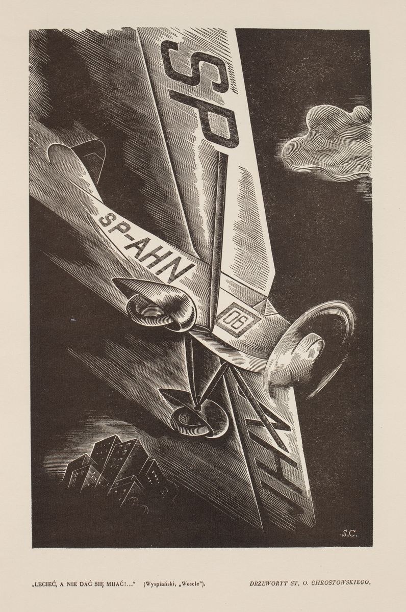 Sygnowany z klocka p.d.: S.C.; pod ryciną: „Lecieć nie dać się mijać!...” (Wyspiański, „Wesele”). Drzeworyt St.O.Chrostowskiego.