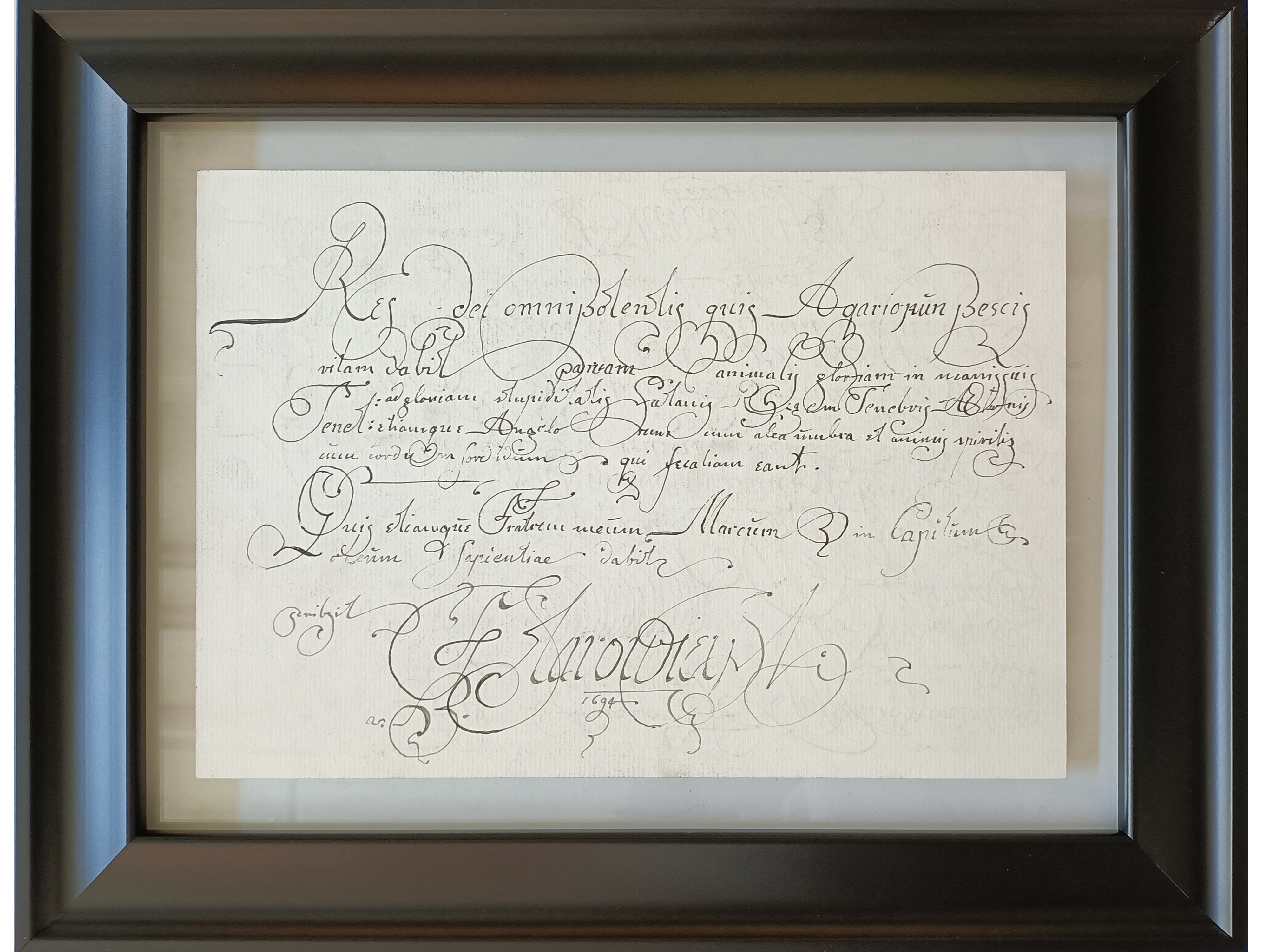 Kaligrafia; tekst o charakterze religijnym, pisany w języku łacińskim. Franciszek Starowieyski był artystą, który w sposób bardzo sprawny i umiejętny tworzył na papierze formy o wyrafinowanej ornamentacji, przywodzące na myśl kulturę baroku (w szczególności można to zauważyć na pracach wykonanych za pomocą piórka i tuszu). Dowodem na to są jego zdobione artystycznie kaligrafię, które jednak wśród zbiorów pozostają w mniejszości, czyniąc je dziełami unikatowymi, a zarazem ikonicznymi.