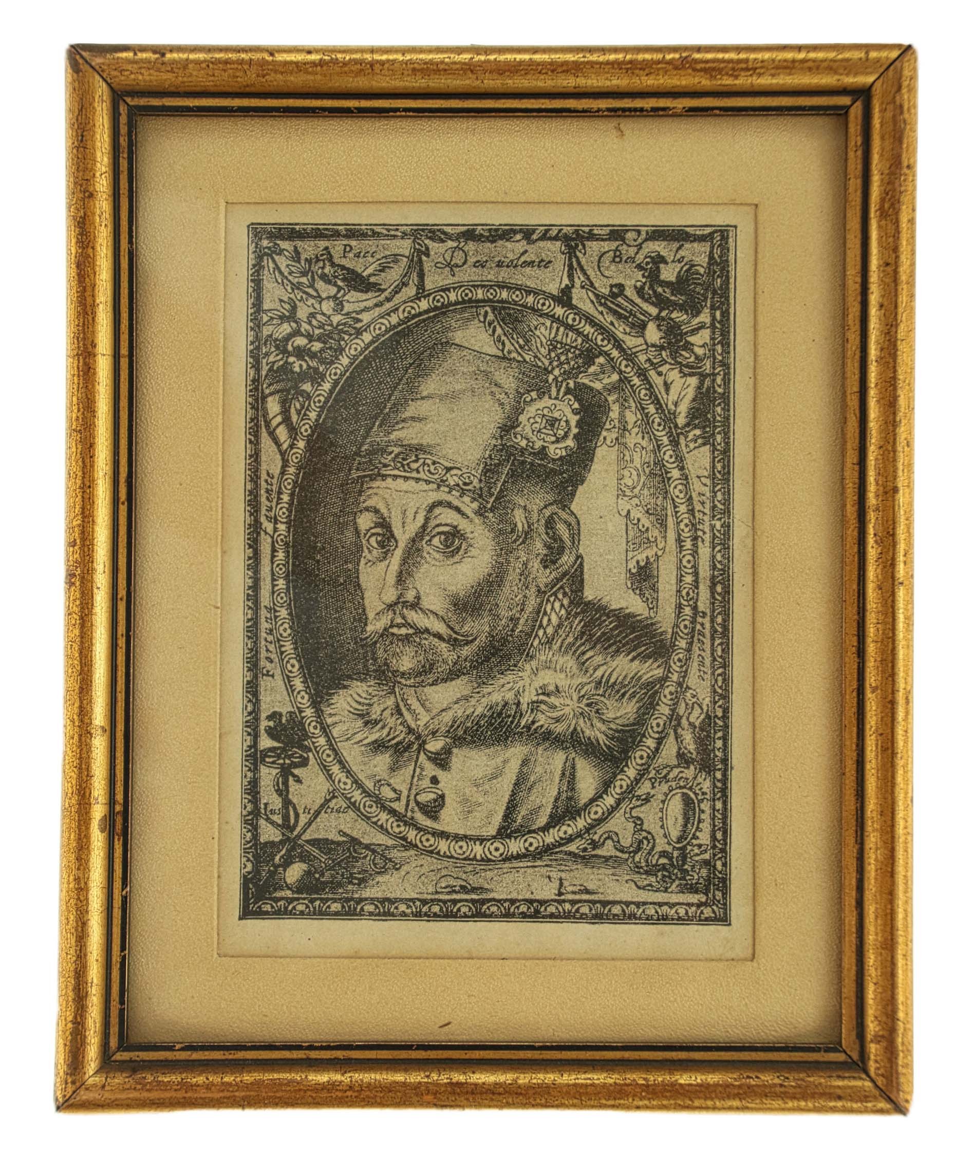 Litografia z wizerunkiem króla Stefana Batorego za szkłem. Wym. litografii 15,5 x 11 cm, wym. ramy 21,5 x 17,5 cm.