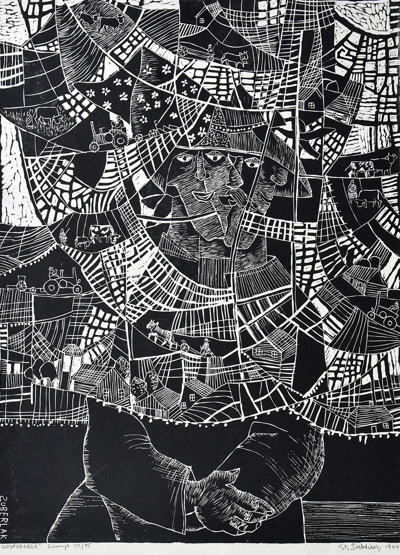 linoryt, 12/15, 73 x 55,2 cm, sygn. oł. p.d.: St. Suberlak 1964, oraz na kamieniu l.d.: Suberlak; oł. l.d.: "Gospodarze" linoryt 12/15. Grafika z kolekcji Józefa Wróbla (1938-2023), wybitnego fotografa, w latach 1957-1997 fotoreportera redakcji Tygodnika Ilustrowanego "Panorama".