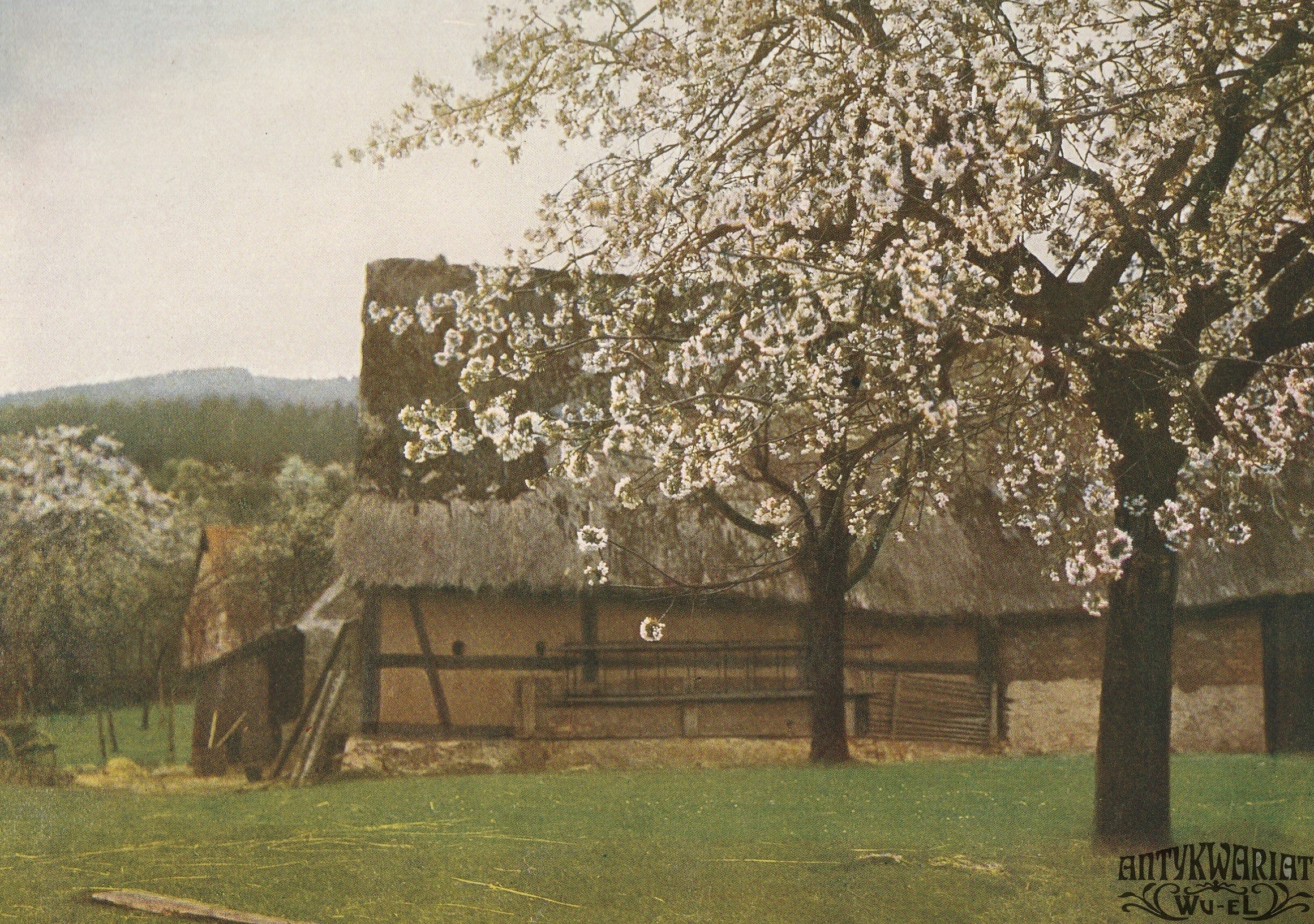 SULISTROWICE (pow. wrocławski). Wiśniowy sad. Wg fot. Juliusa Hollosa, na ozdobnym kartonie, kolor., st. bdb., pergaminowa bibułka ochronna, tabl. 20 z teki Schlesien II…; Kirschblüte in Sylsterwitz am Zobten.